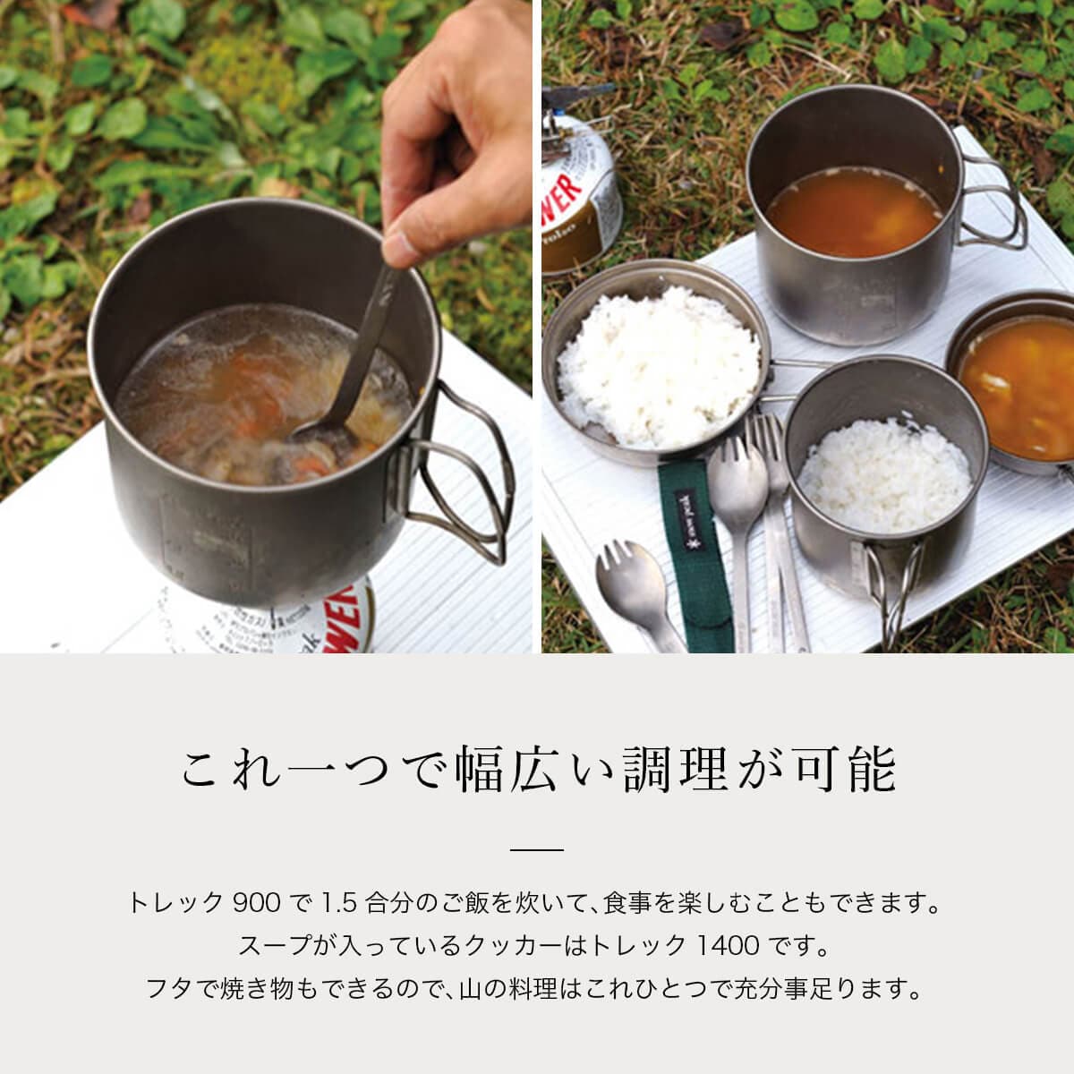ベーシックなチタン製深型クッカー。トレック900がすっぽり収まるサイズで、グループや家族での使用に最適です。