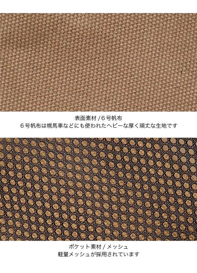 ■素材:綿帆布(6号・パラフィン・PU加工)、アクリルテープ(中芯:PP)、ナイロンメッシュ