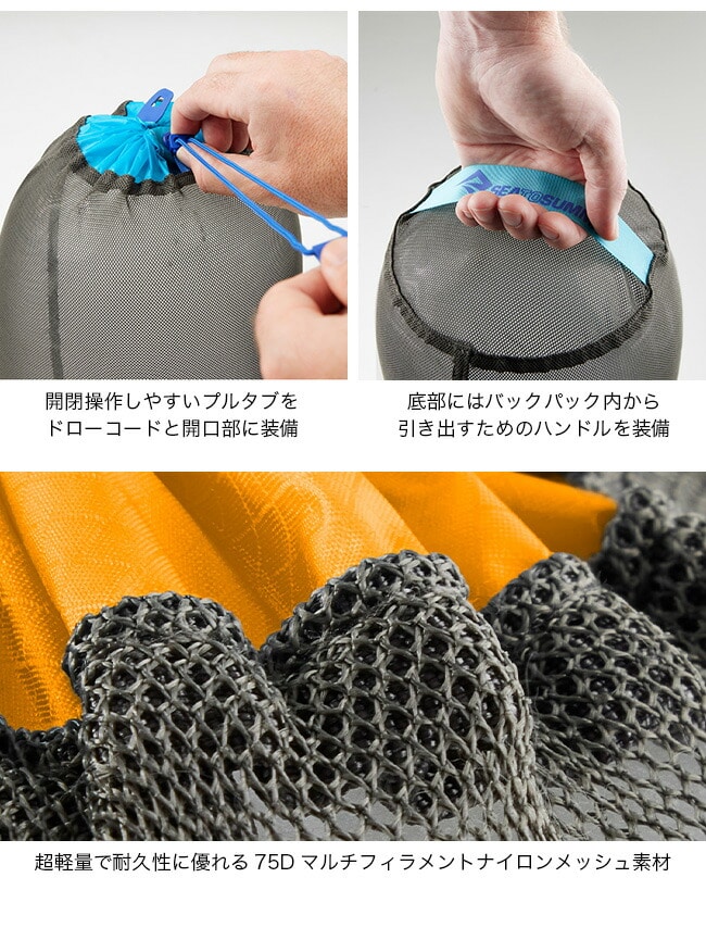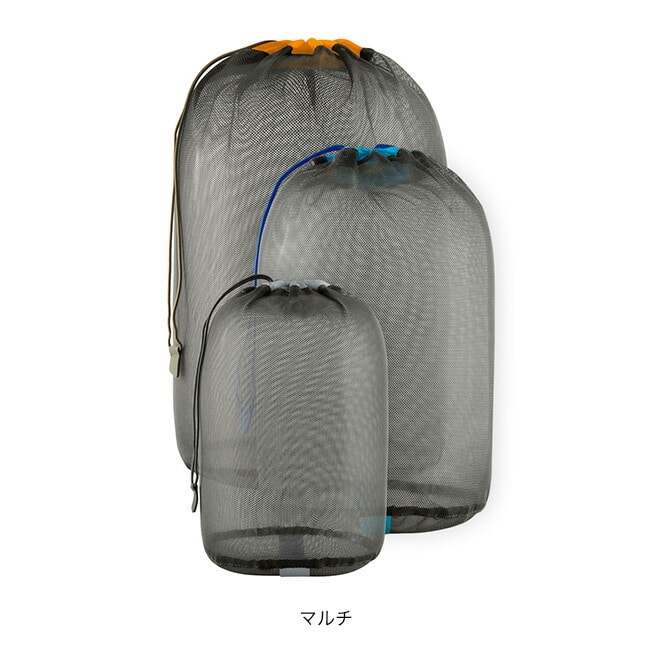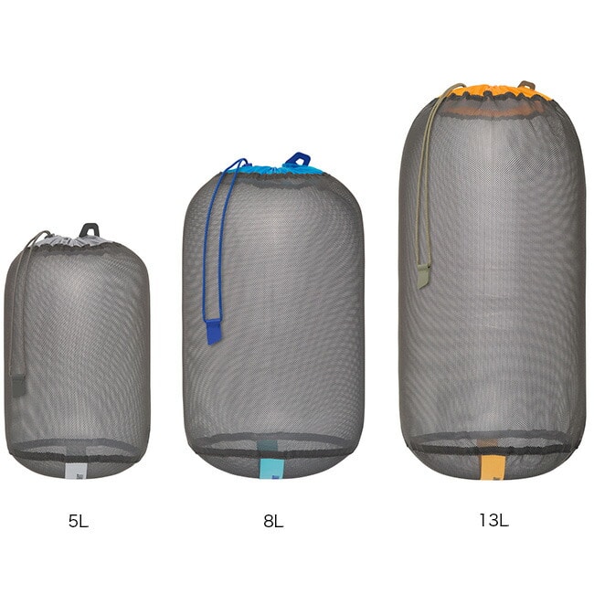 通常のスタッフサックと同様の丈夫な構造はそのままに、メッシュ生地を採用しています。スリーピングバッグの自宅収納や濡れものの収納、キャンプ時の食器乾燥などさまざまに活躍します。