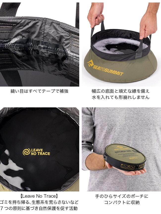 幅広の底面としっかりとした縁設計により、水を入れても型崩れしにくく、安定した使い心地を実現したポータブルキッチンシンクです。素材には防水認証を取得したリサイクル70Dナイロンを採用し、すべての縫い目にテープ加工を施すことで、高い防水性と速乾性を確保しています。