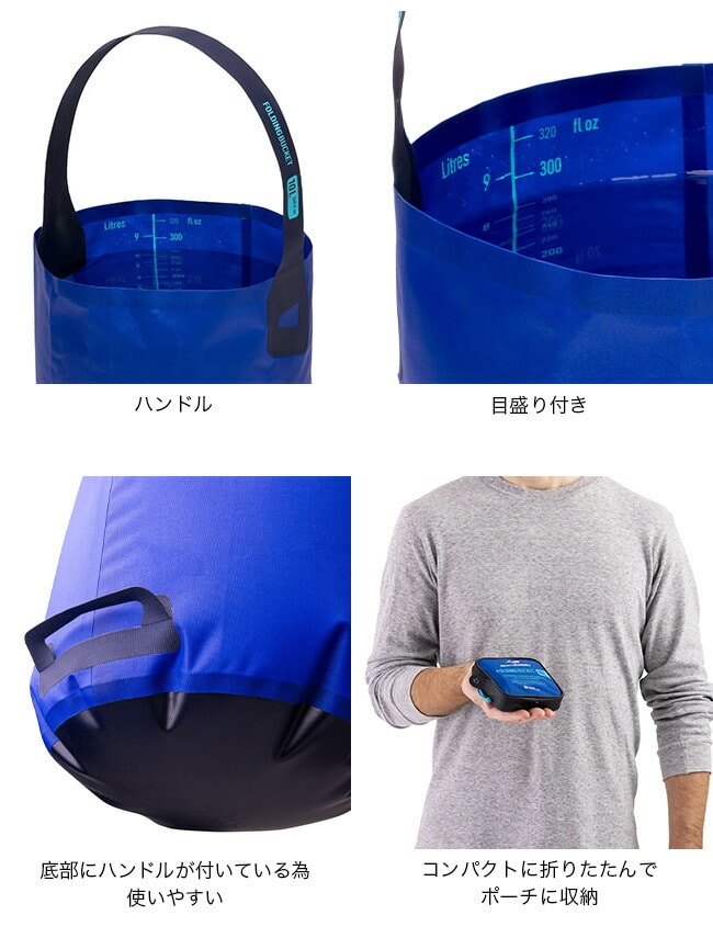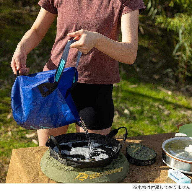 水の汲み取り・持ち運び・注ぎ出しがしやすい設計で、キャンプ場や野外での水の確保に便利。底部にはハンドルを備え、安定して持ち上げることができます。