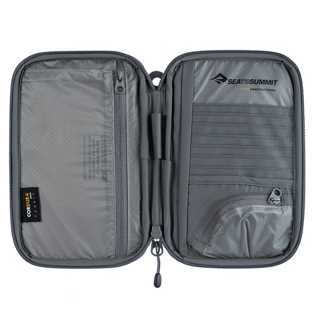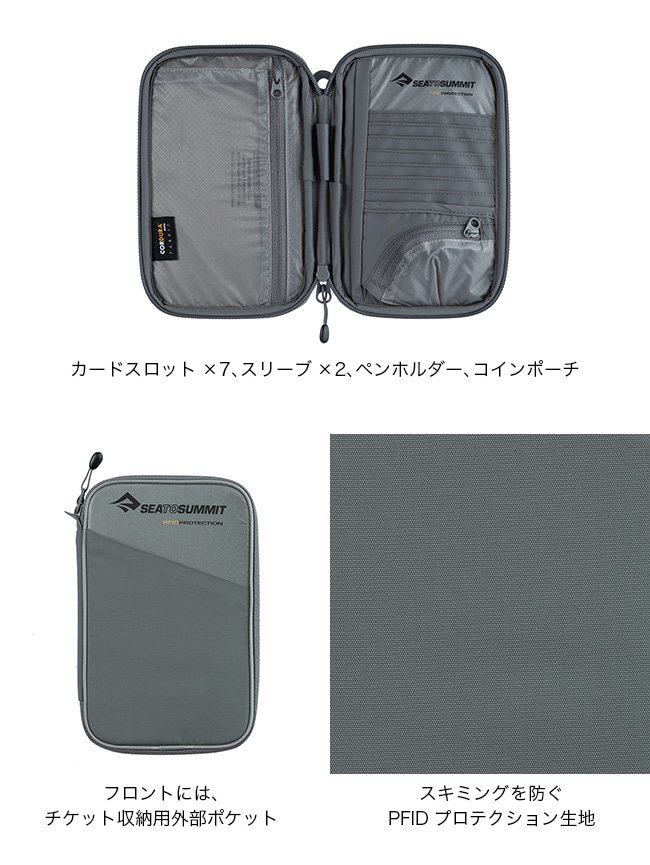 旅行資料、カード、小銭、手帳などを安全かつ効率よく整理できます。RFIDプルーフ生地を内蔵し、スキミング被害を防ぎます。