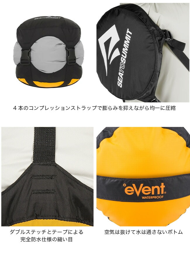 ボトムに使用されている防水透湿素材eVentファブリックは、空気は出しても水は通さない構造。バルブやストラップ締めによる圧縮ではなく、開口部をロールすることでボトムから内部の空気を逃します。
