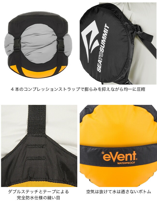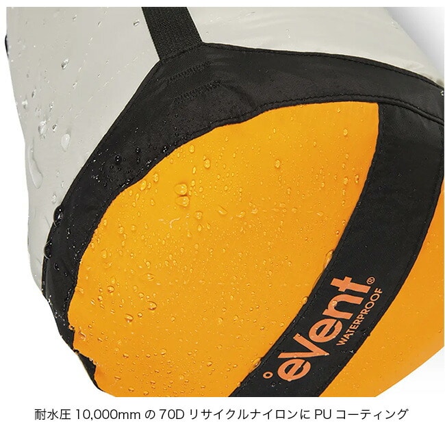 ボトムに使用されている防水透湿素材eVentファブリックは、空気は出しても水は通さない構造。バルブやストラップ締めによる圧縮ではなく、開口部をロールすることでボトムから内部の空気を逃します。
