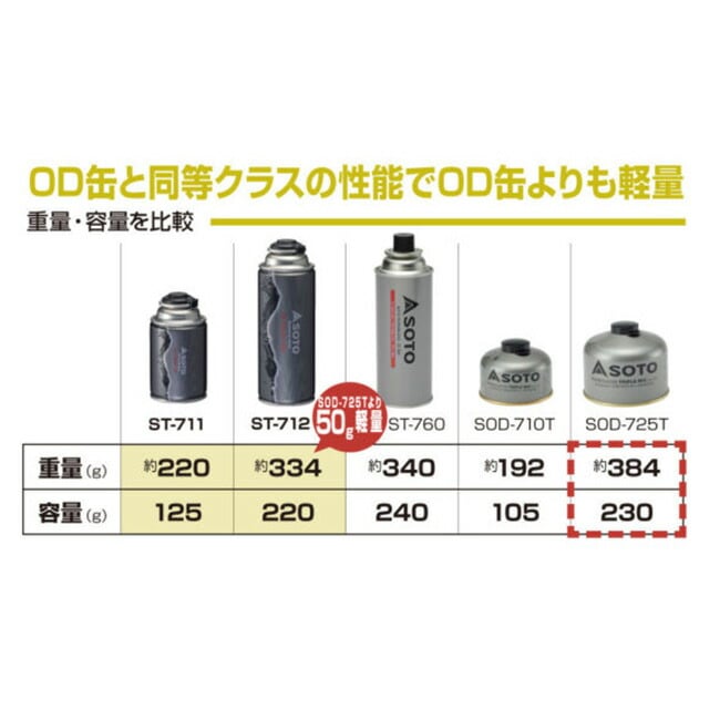 また、耐圧容器(ボンベ)を使用することで気温が高くなる夏場でも安全に持ち運べ、OD缶よりもリーズナブルな価格でありながら、SOTOのOD缶と同等の環境でガス器具の使用が可能になりました。