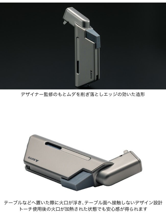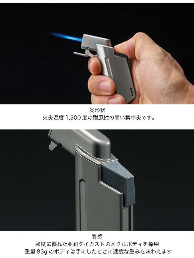 仕上がりが美しいだけでなく、強度に優れた亜鉛ダイカスト成形のメタルボディは、小型でありながらも適度な重量感と心地よい使用感を味わえます。使用後テーブルなどへ置いた際に、熱くなった火口が接触しないデザイン設計のため、安心してご使用いただけます。