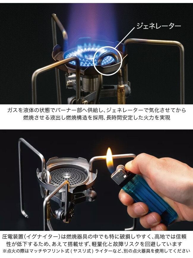 また、燃焼器具で最も破損しやすい部品であり、高地では信頼度の低いイグナイターを、あえて付けないことで軽量化と微細なリスクを排除しています。