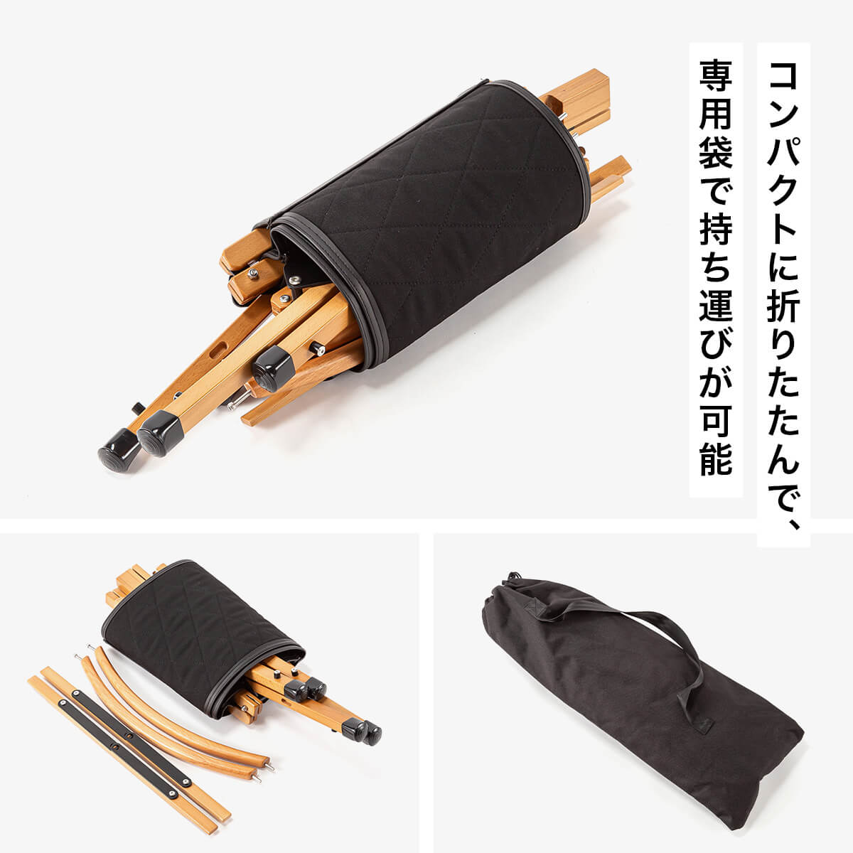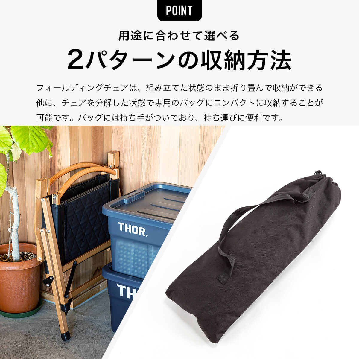 組み立てた状態のまま折り畳んで収納ができる他に、チェアを分解した状態で専用のバッグにコンパクトに収納することが可能です。
