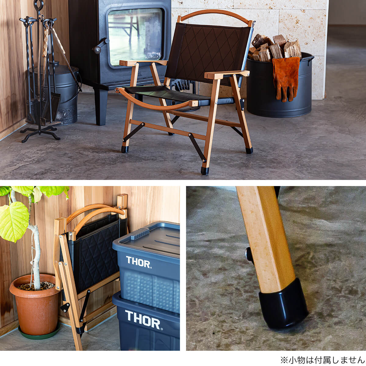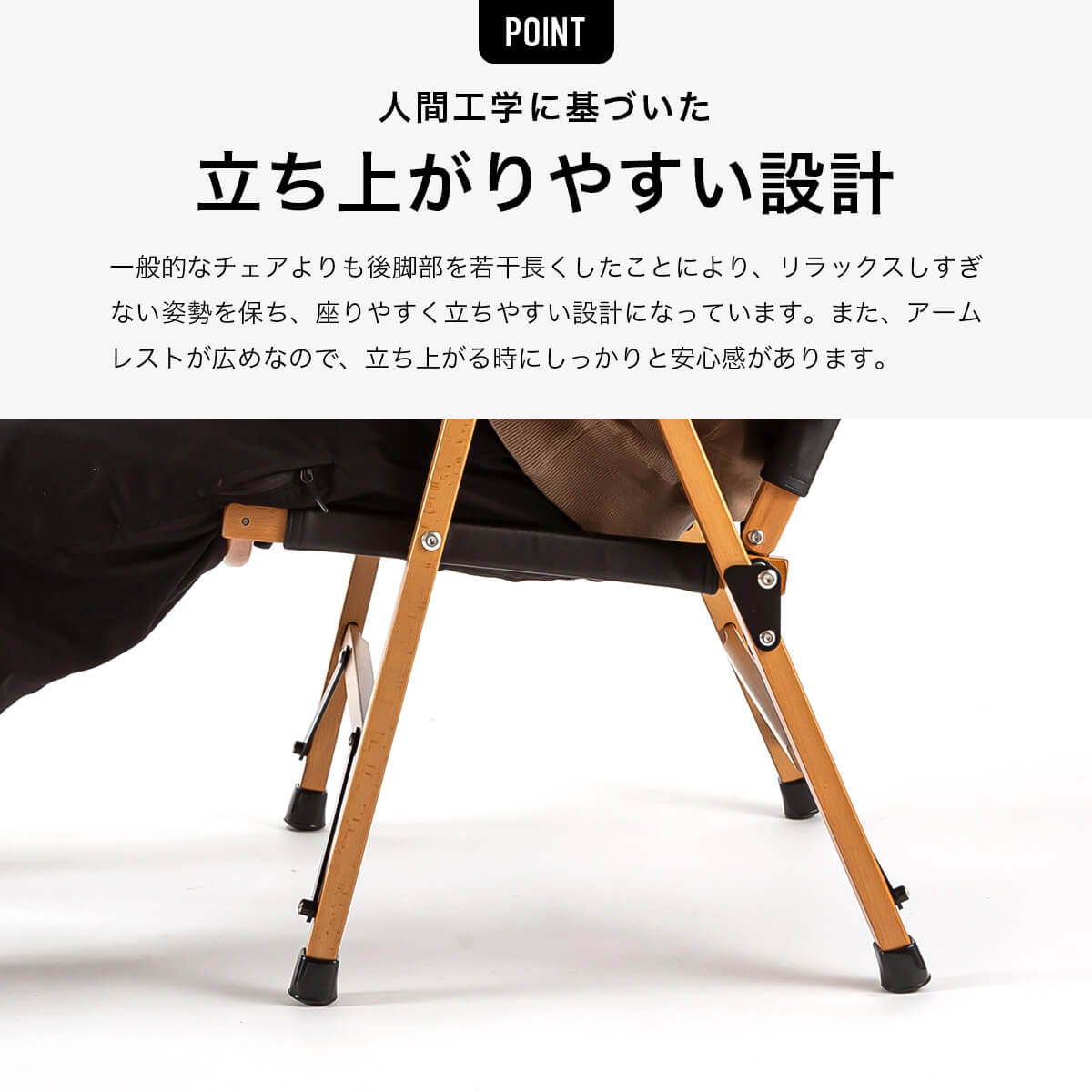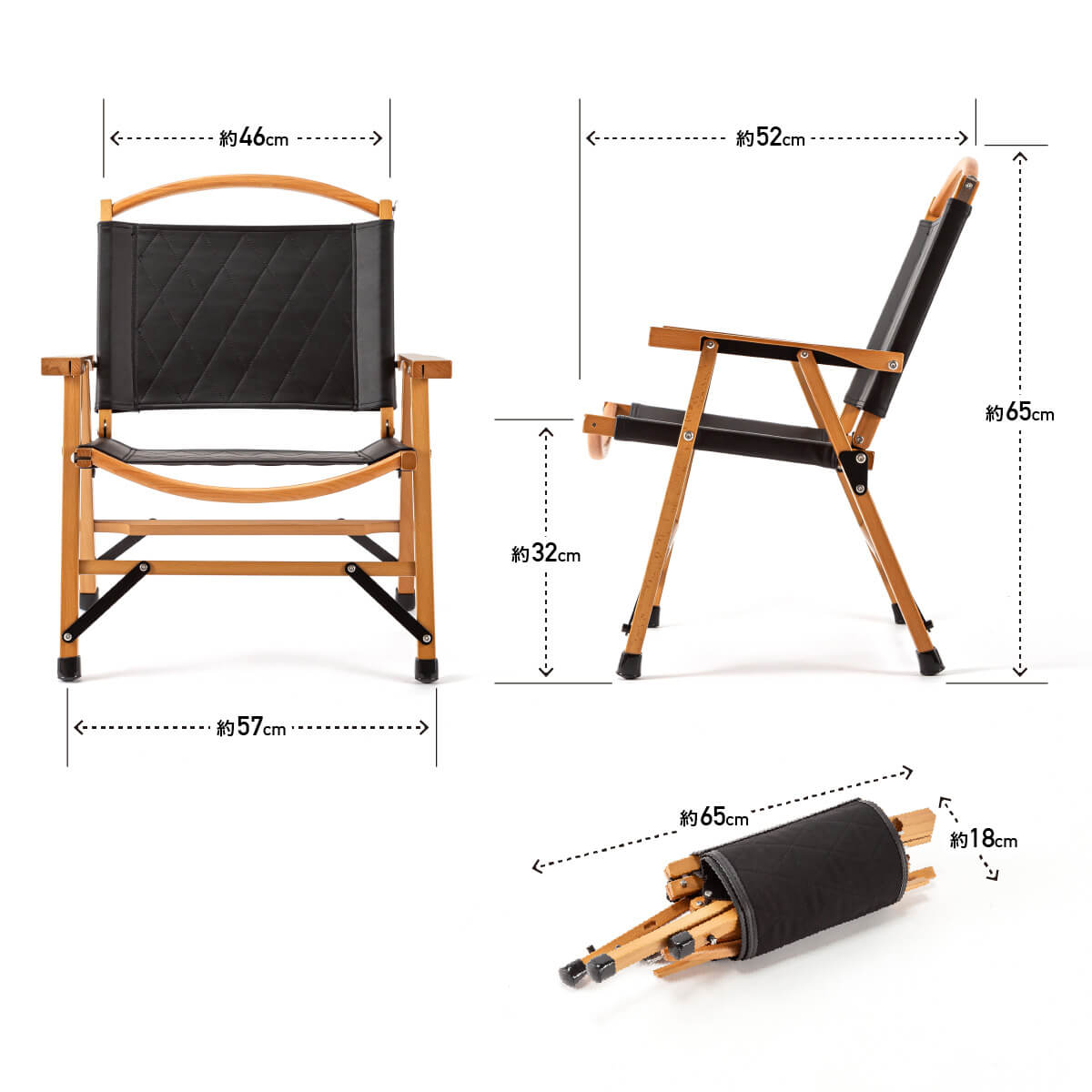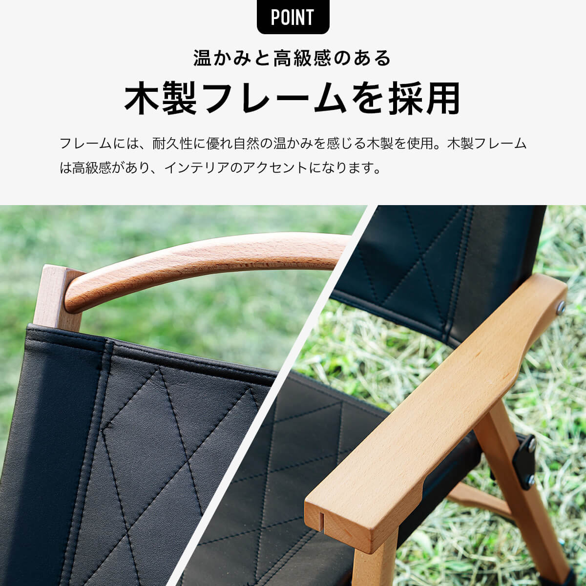 また、落ち着いた色味の木製フレームは高級感があり、チェアをキャンプサイトやお部屋に置くだけで、インテリアのアクセントになります。