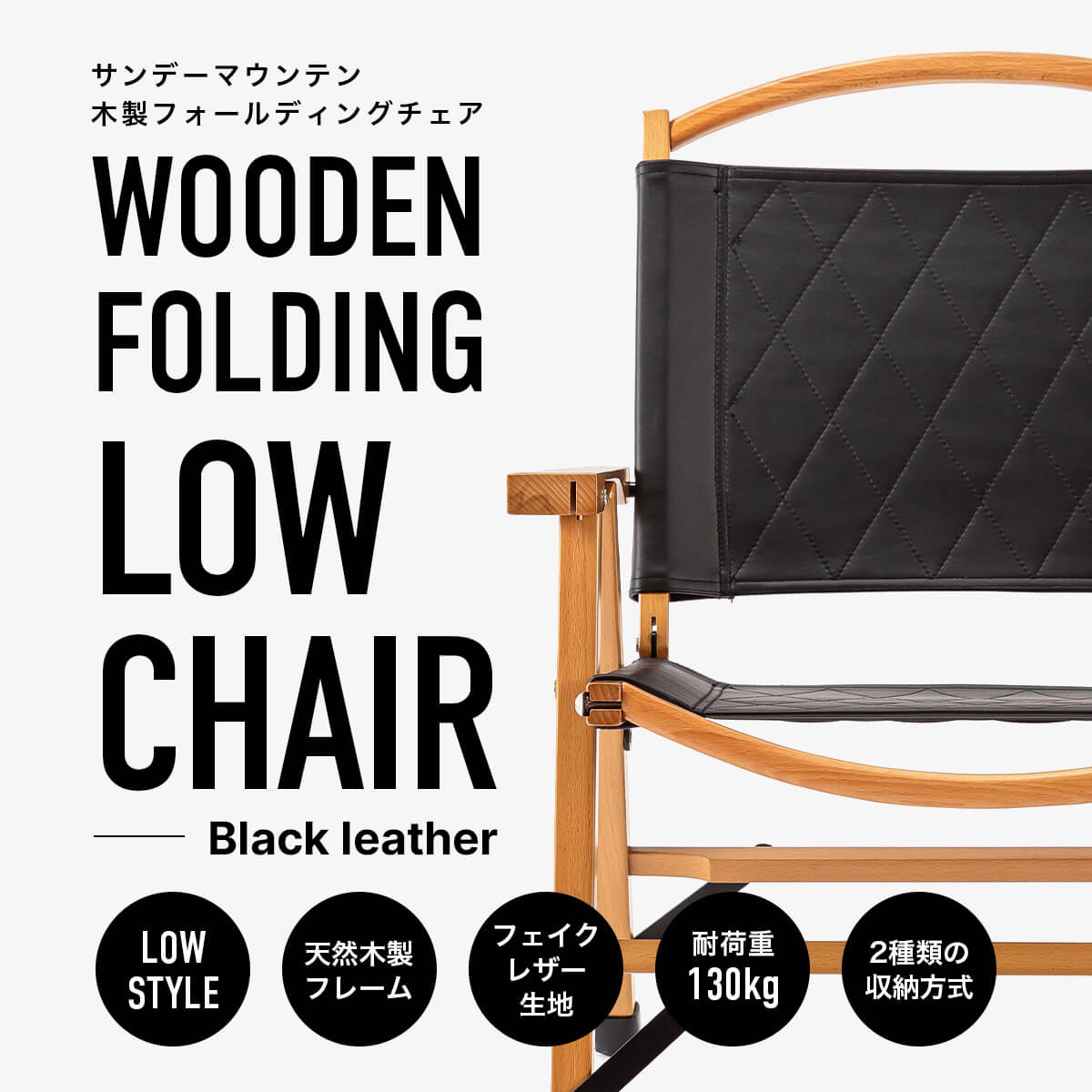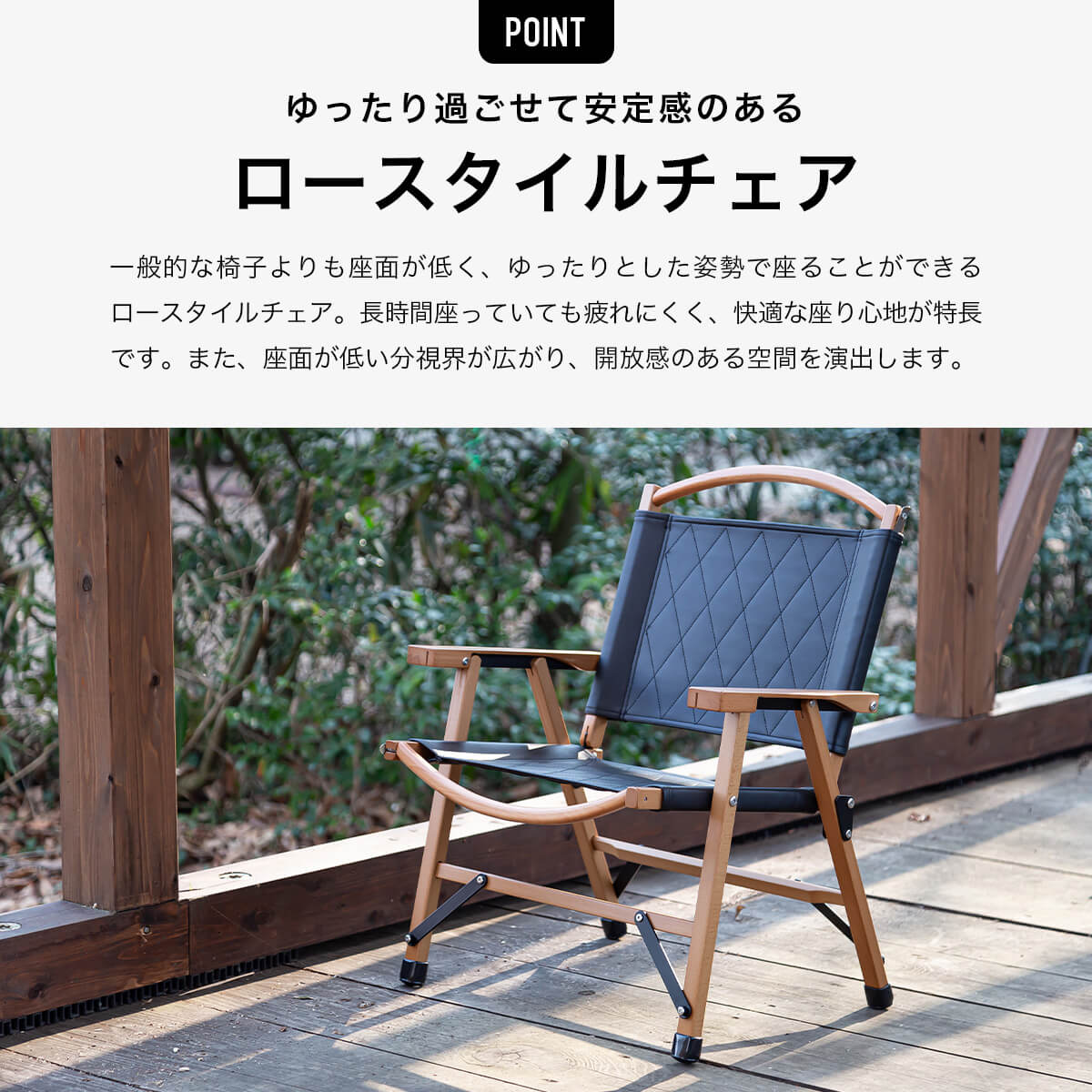 温かみのある木製フレームと通気性に優れた生地を使用した、ロースタイルのフォールディングチェア。