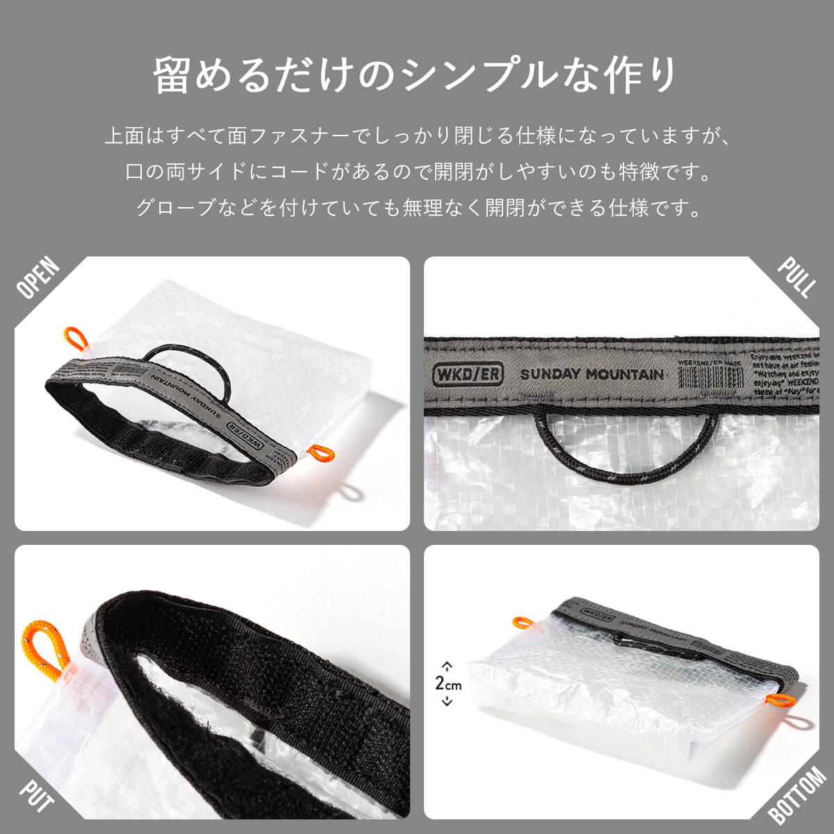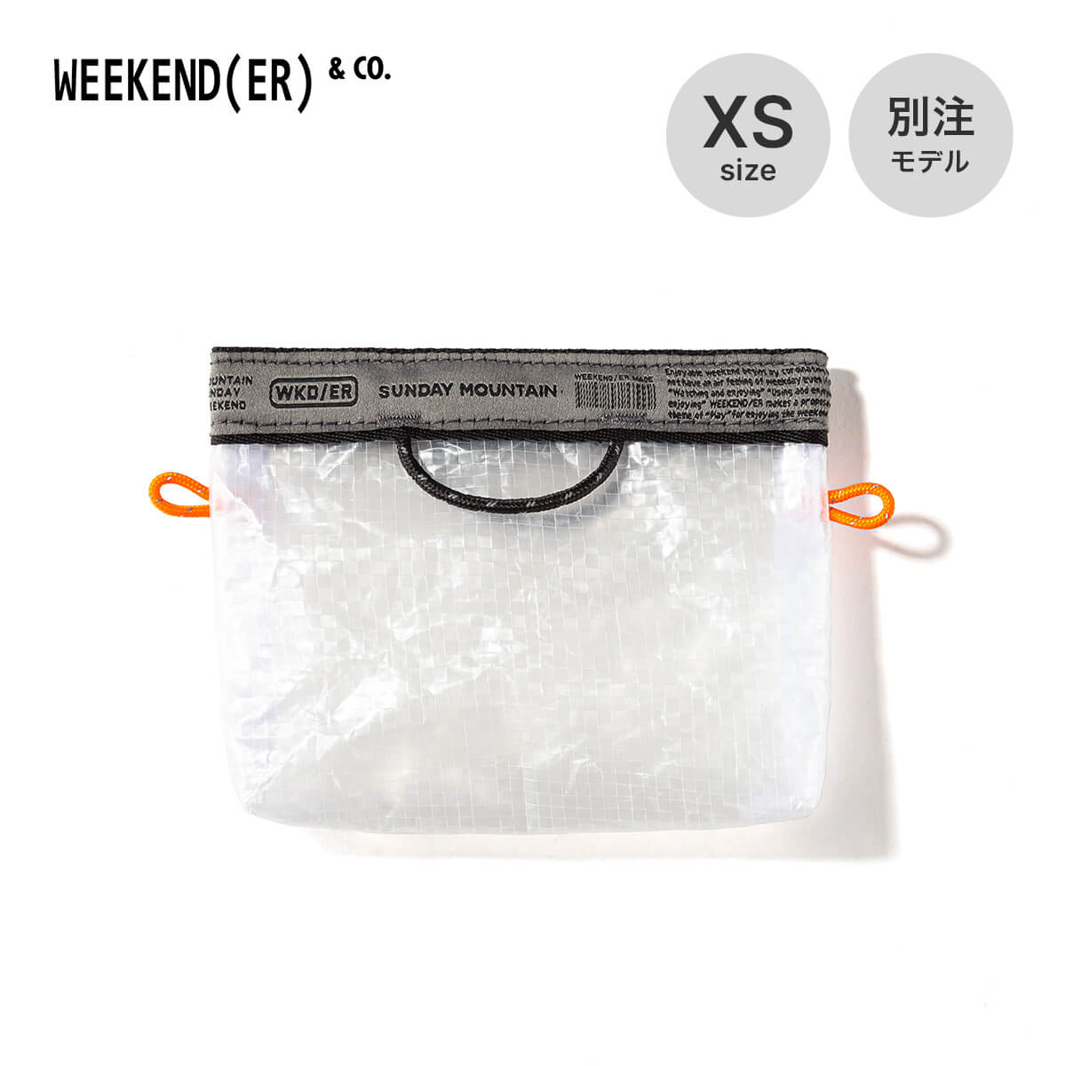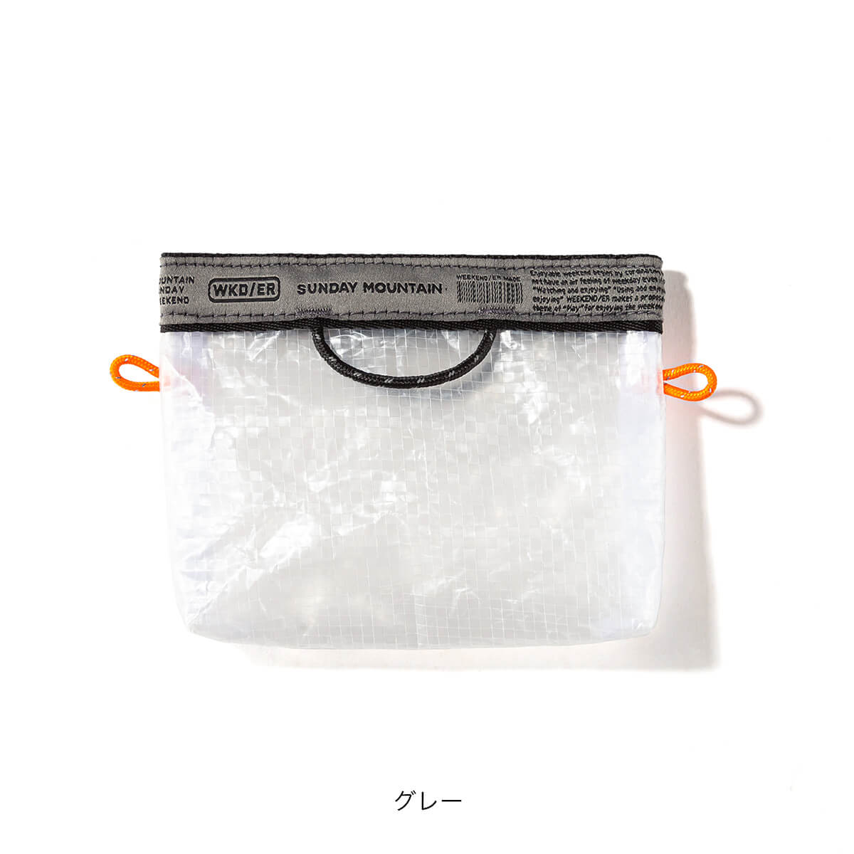 SUNDAY MOUNTAINが、マチ付きの仕様にした上でテープ部分をオリジナルデザインのグレーに、ループコードをオレンジに別注しました。