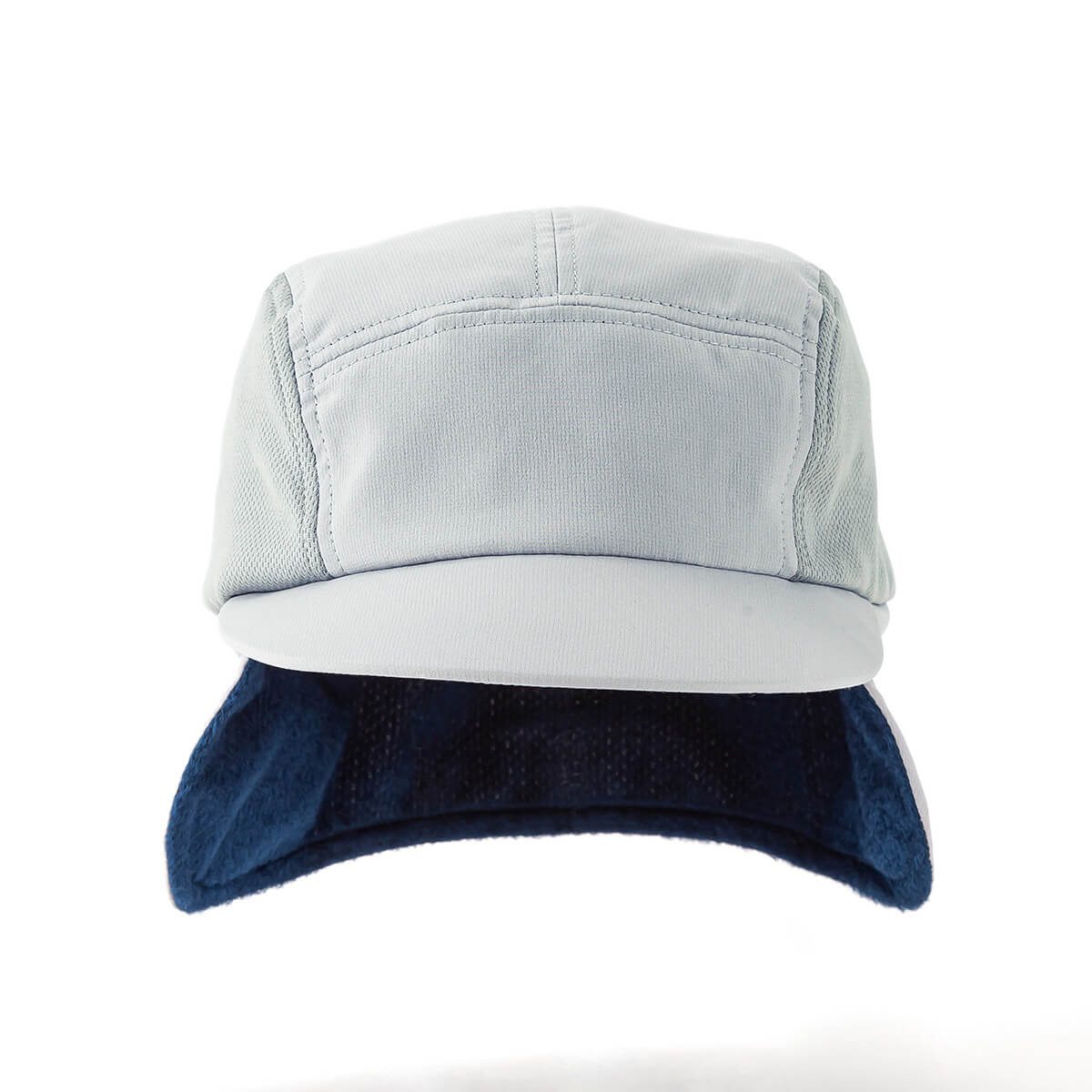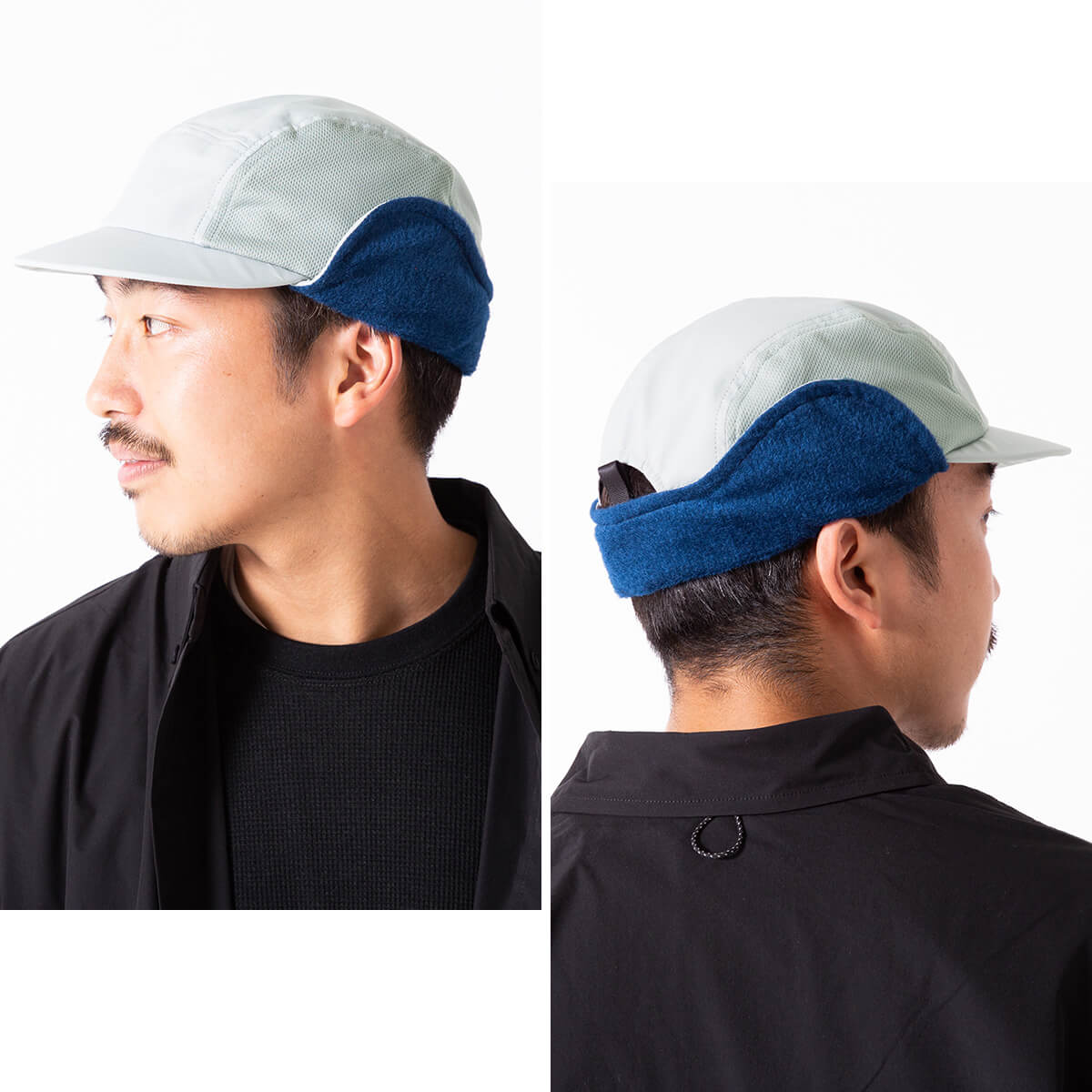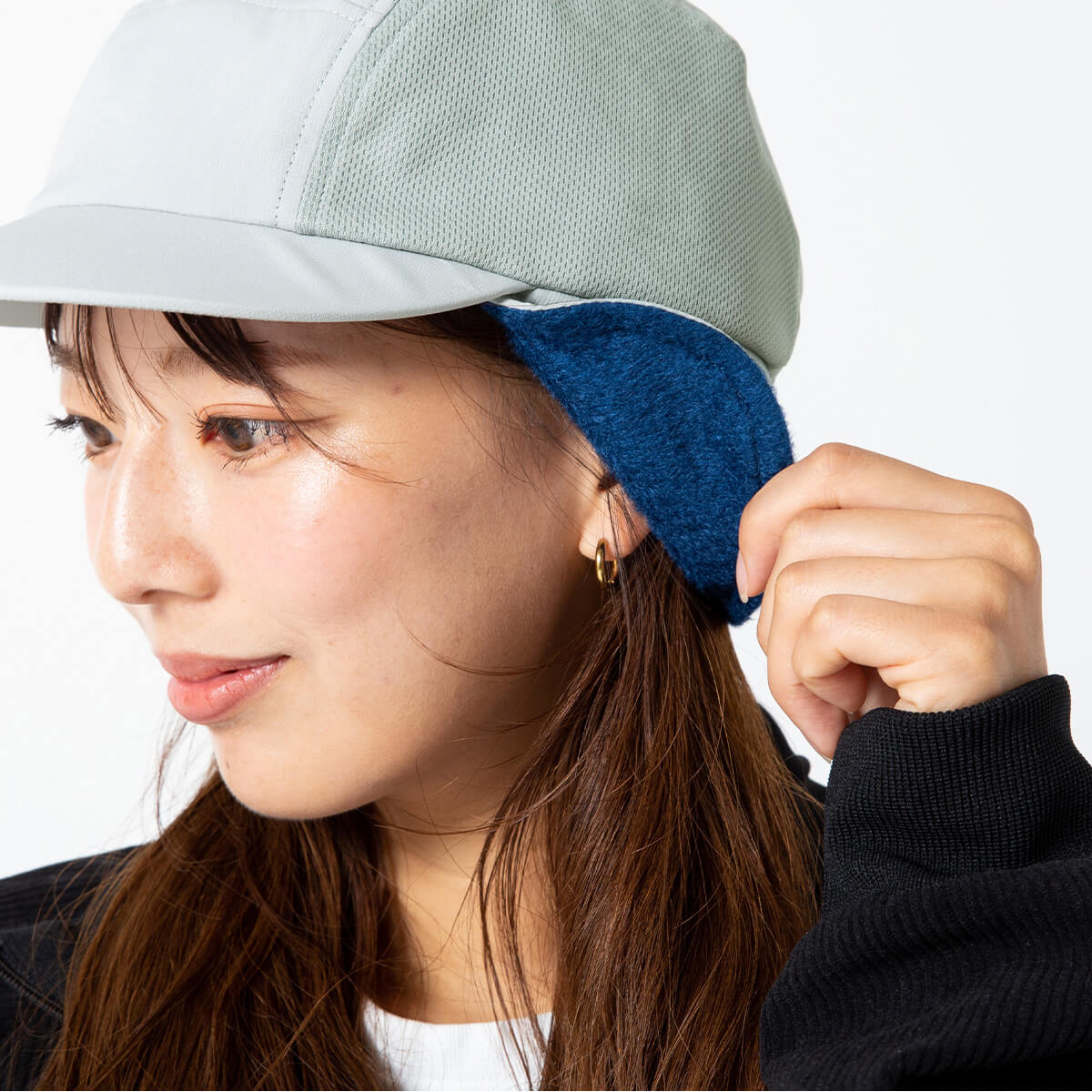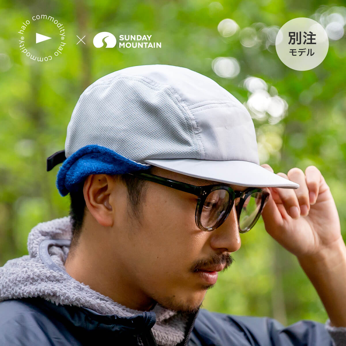 Octa®を耳あてに、サイド部分には抗菌防臭・制菌、吸水速乾性のあるメッシュ素材を採用した、SUNDAY MOUNTAIN別注カラーのキャップです。どんなカラーのお洋服にも合わせやすい明るめのグレーをベースに、耳あて部分はアウトドアシーンで映えるブルーを差し色に選びました。