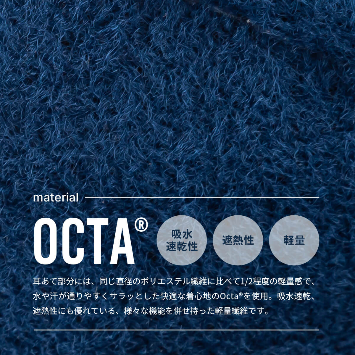 耳あてには、同じ直径のポリエステル繊維に比べて、2分の1程度の軽量感でサラッとした快適な着心地で、吸水速乾、遮熱性にも優れたOcta®を使用しています。