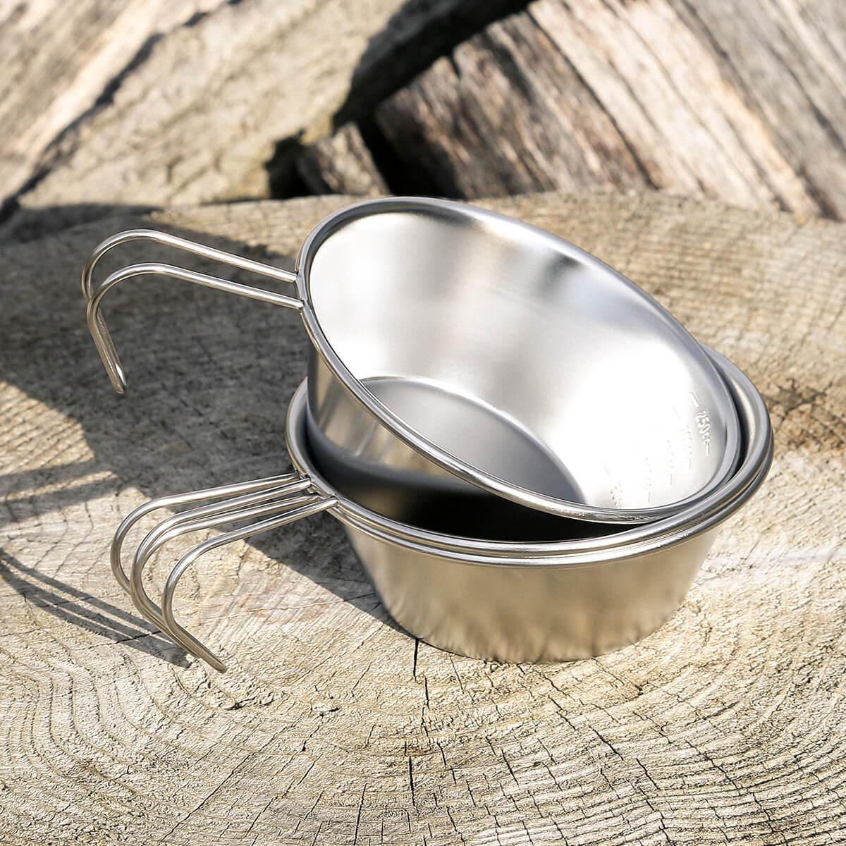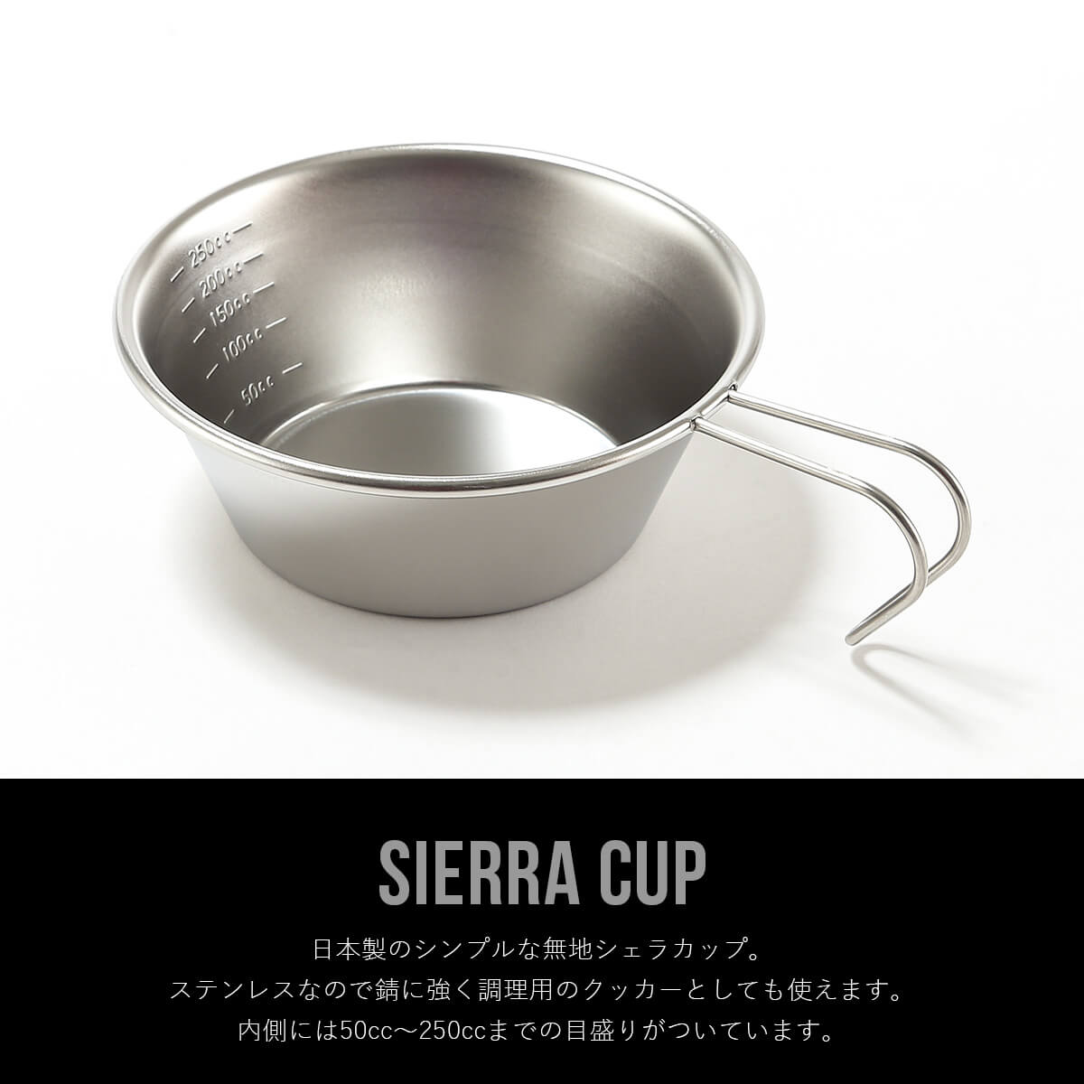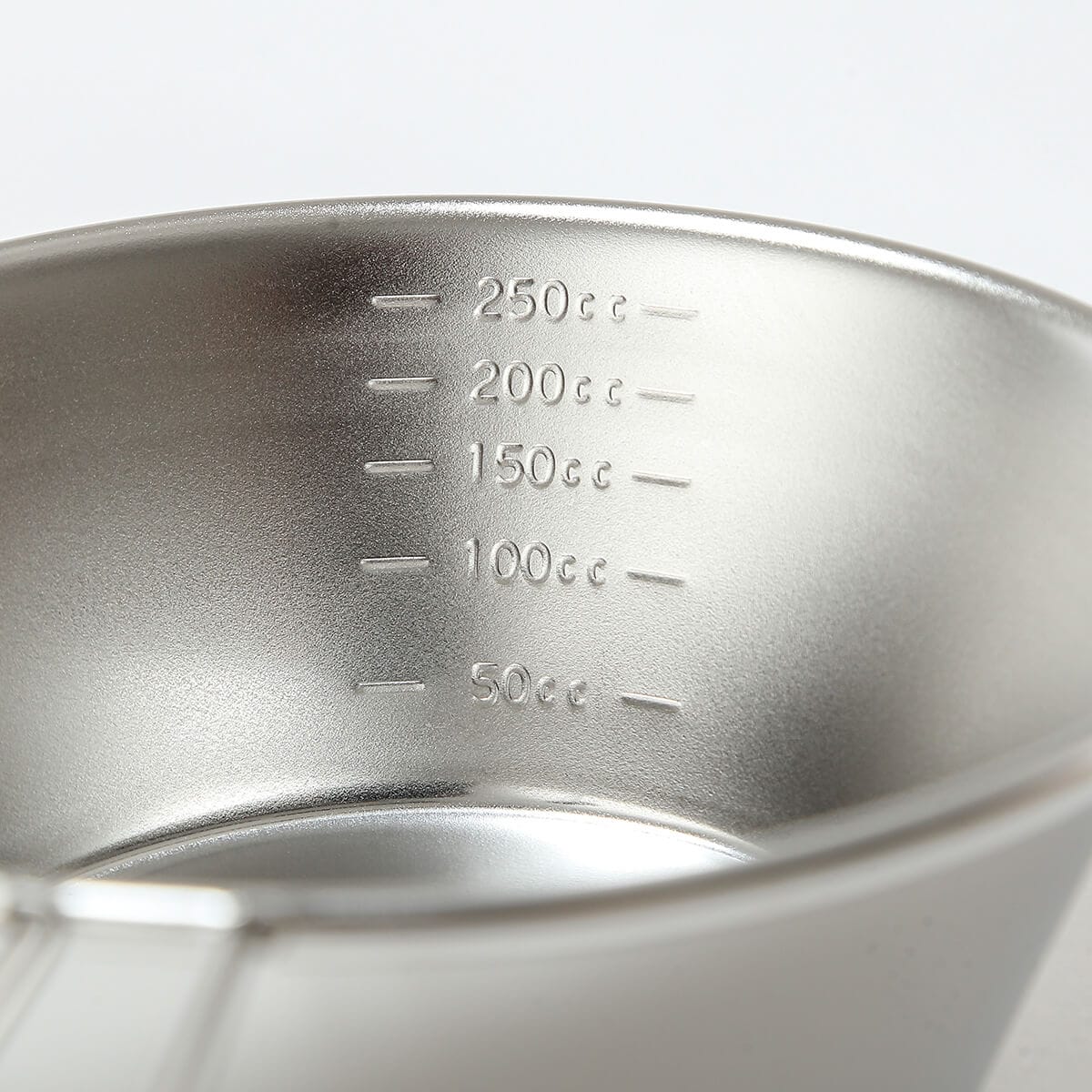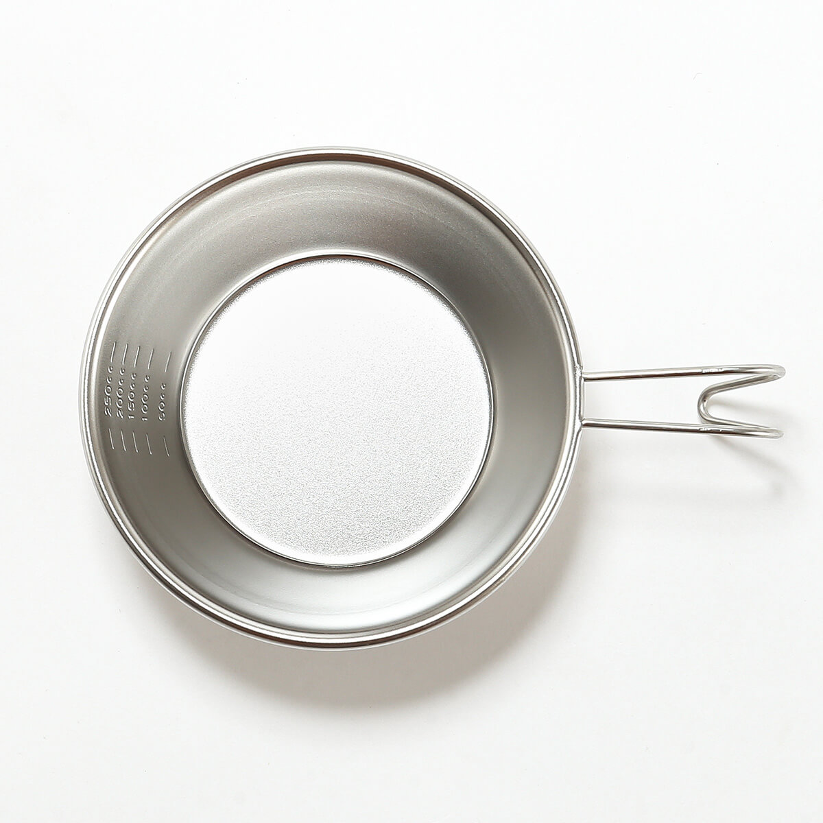 ステンレスなので錆に強く調理用のクッカーとしても使えます。内側には50cc~250ccまでの目盛りがついています。