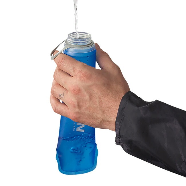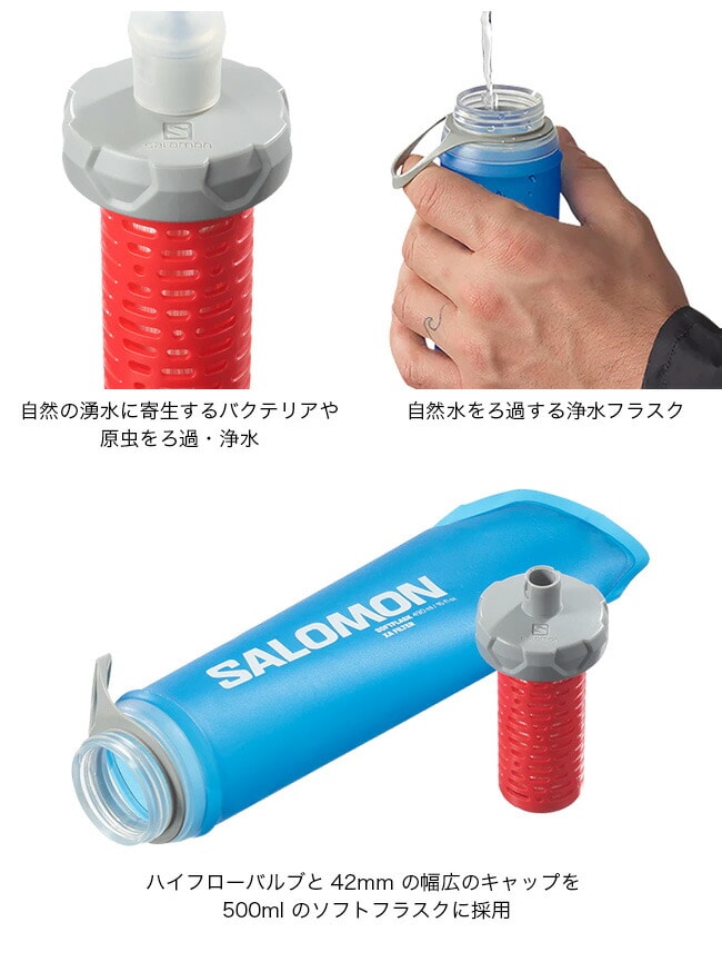 自然の湧水に寄生するバクテリアや原虫をろ過・浄水するため、大量の水を携行しなくても、安心して水分を補給できます。フラスクは飲むと圧縮されるので、水が跳ねたり揺れることがなく、正確な残量も一目で確認できます。