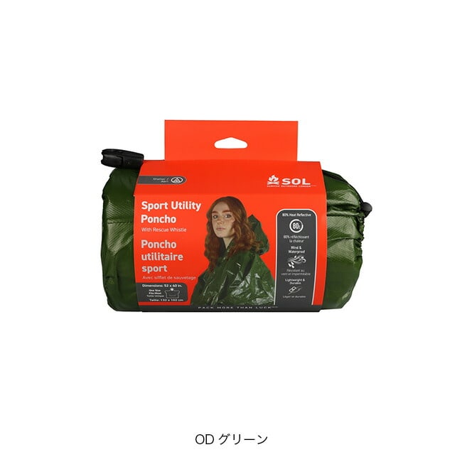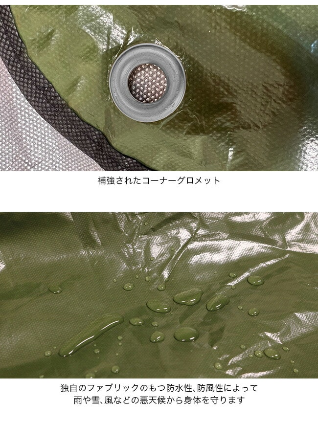 緊急時にシェルターを設置できるよう補強されたコーナーグロメットと、レスキューホイッスル、スタッフサックにはティンダーコードを備えています。