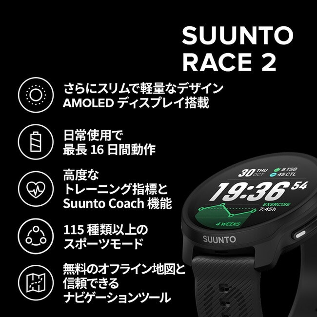 Suunto Race 2 は、重要な場面で最高のパフォーマンスを発揮したいアスリートのためのトレーニング&レース用ウォッチです。大きく明るいAMOLEDディスプレイ、精度が向上した心拍測定、クラス最長クラスのバッテリーと高速充電を搭載。