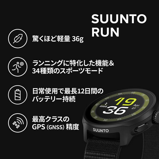 音楽、コンパス、睡眠分析、GPSトラック分析、高度計、天候、インターバルトレーニング、心拍数、スポーツモードなど