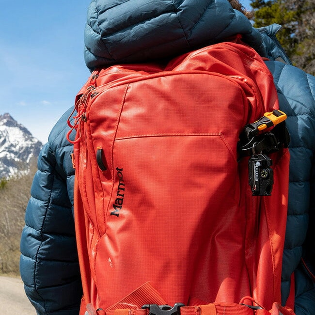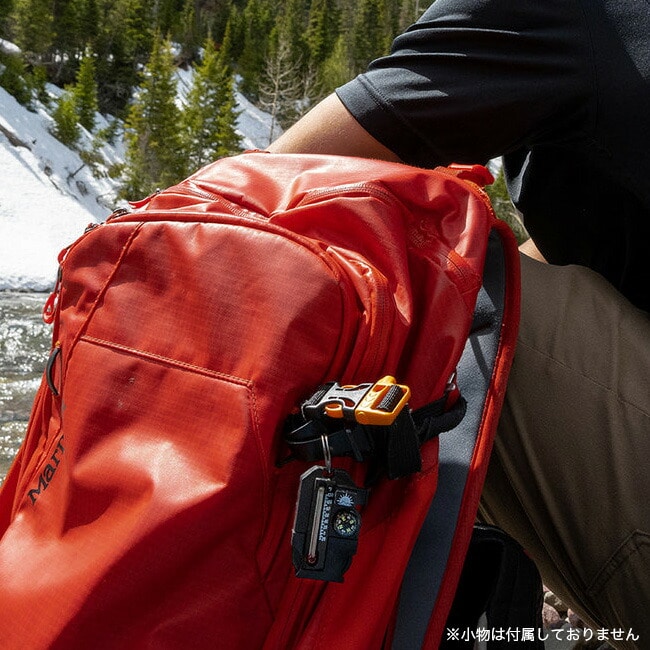 見やすい蓄光コンパス、サバイバルホイッスル、温度計、そして火起こし用のフリントロッドとストライカーです。