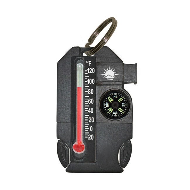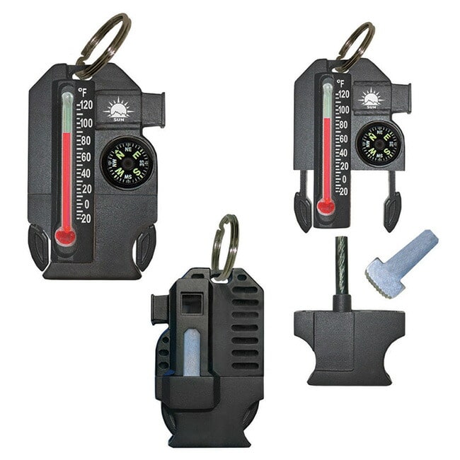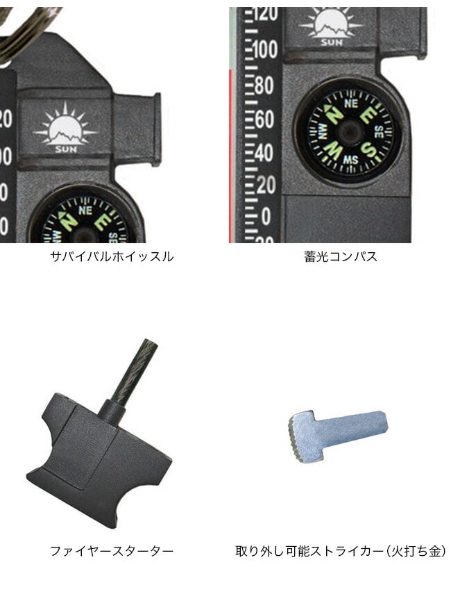 温度計、コンパス、ホイッスル、ファイヤースターターの4つがセットになったサバイバルツールキーホルダー