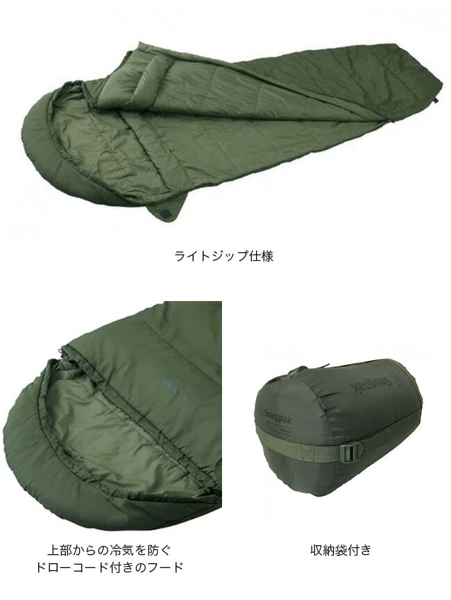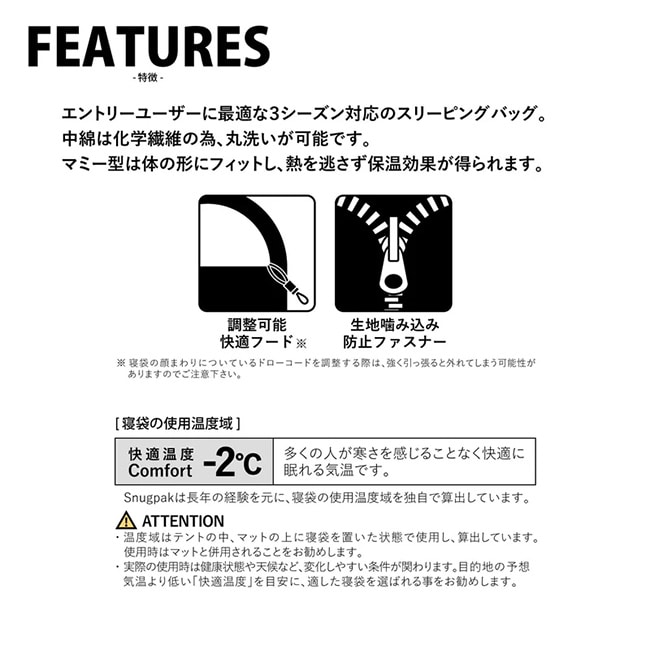3シーズン型のスリーピングバッグ。スクエア型に比べ密閉されており保温性が高く、包まれるような安定感が生まれます。