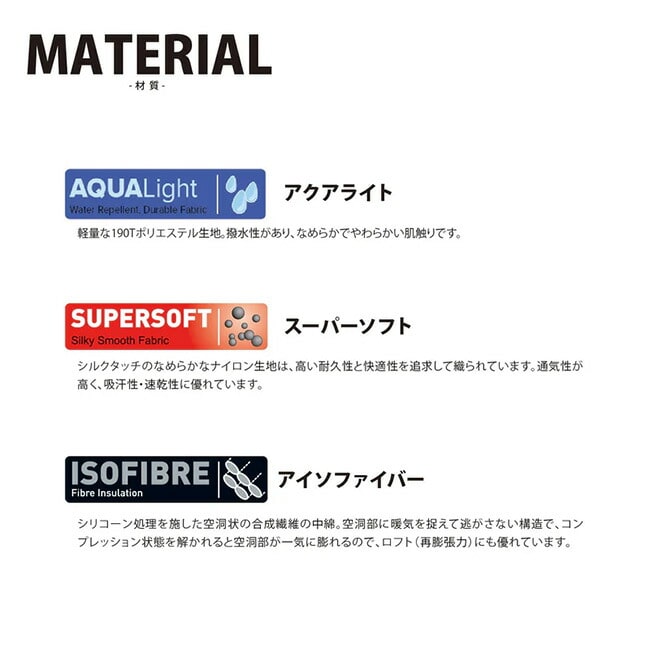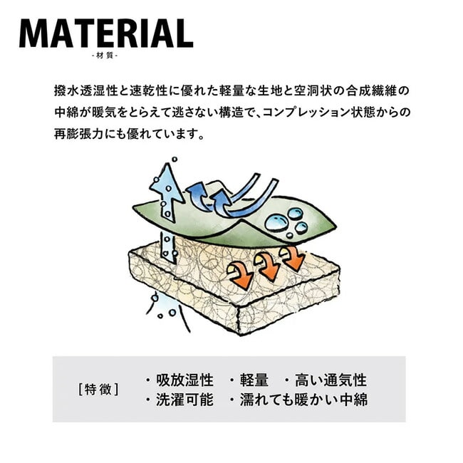 シリコーン製中空繊維の「Isofibre」保温材が中綿として充填されており、この繊維によって温かい空気を維持する事が出来ます。