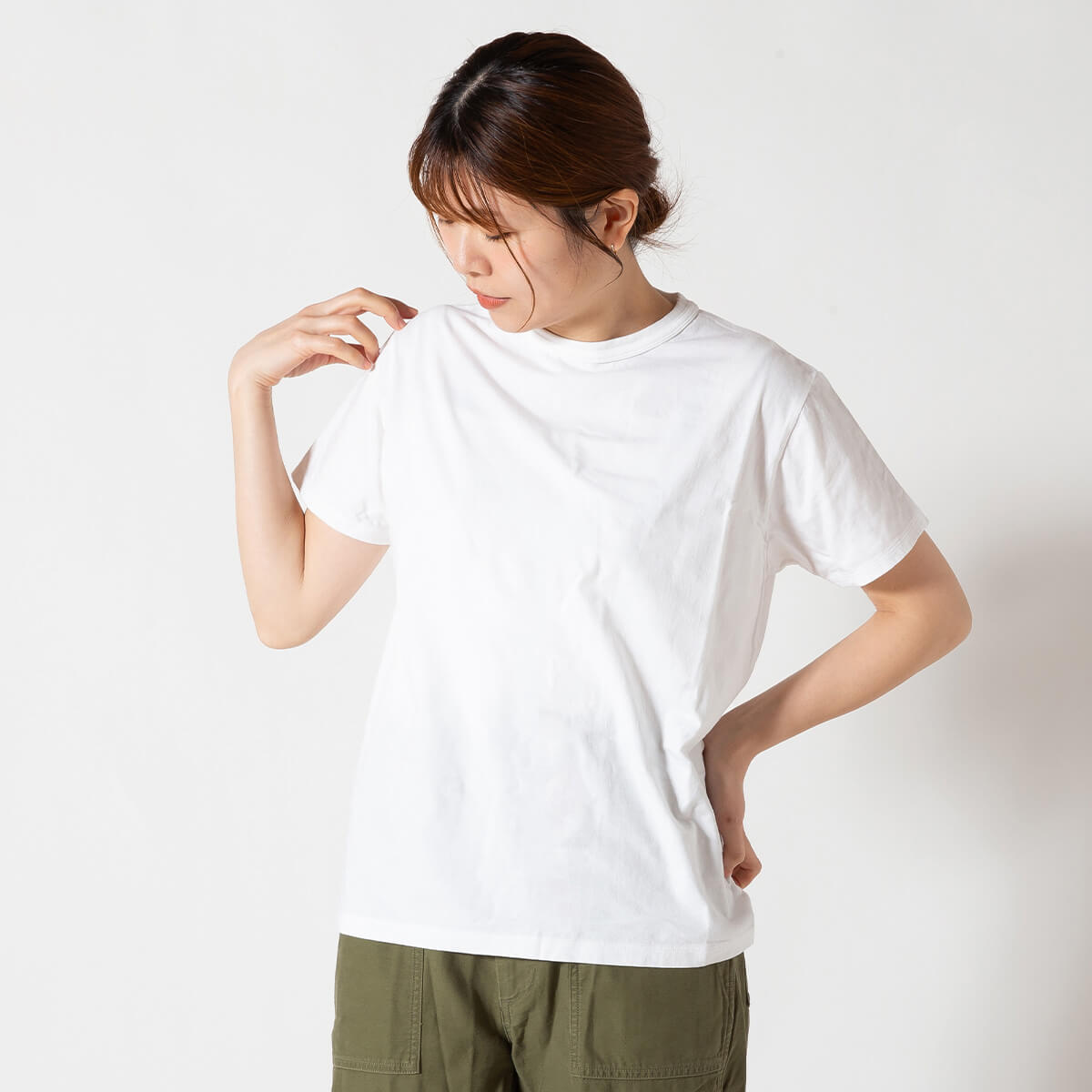 ニットやスウェットとレイヤードした際、首元からキレイにネック部がのぞくよう、サイズとシルエットにこだわって作ったシンプルなTシャツです。インナーとしてはもちろん、1枚でも着られるサイズ感も魅力です。