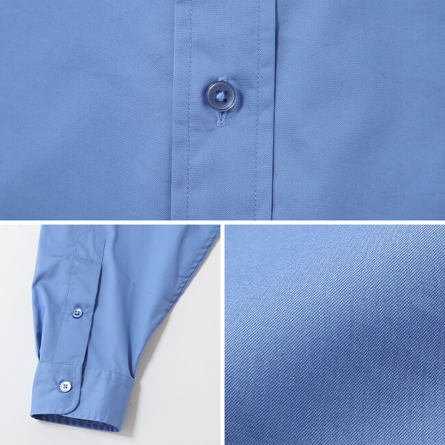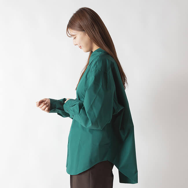 光沢感とハリのある高密度の生地が上品な印象を与えます。また伸縮性があり、シワになりにくい素材のため、ノンアイロンで着用可能です。