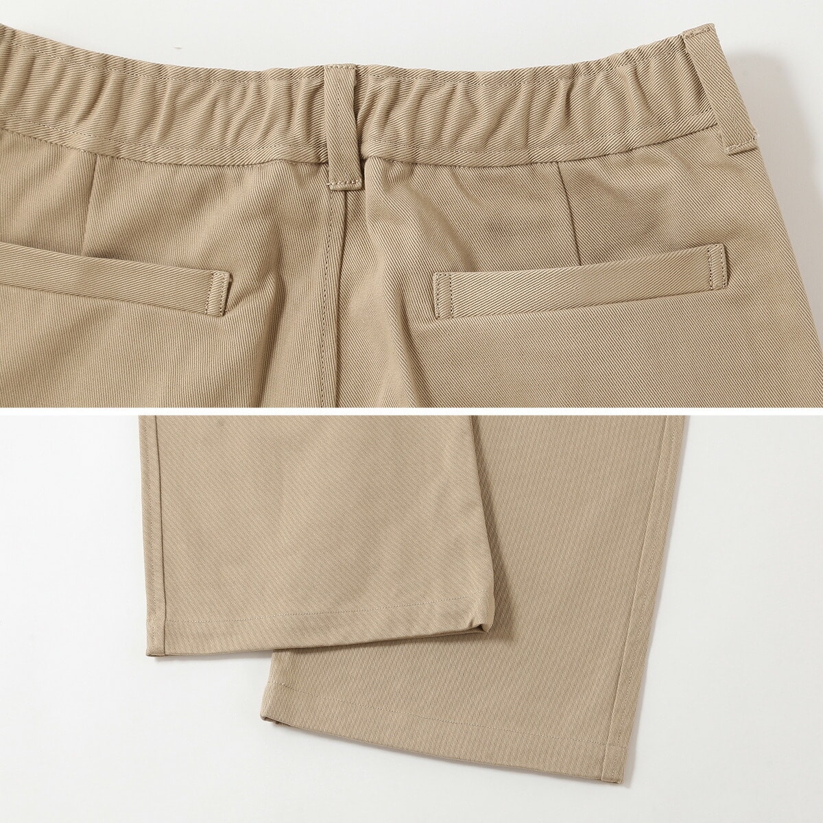 ウエストは前側をすっきりと仕立て、後ろはゴム仕様で快適なはき心地に。