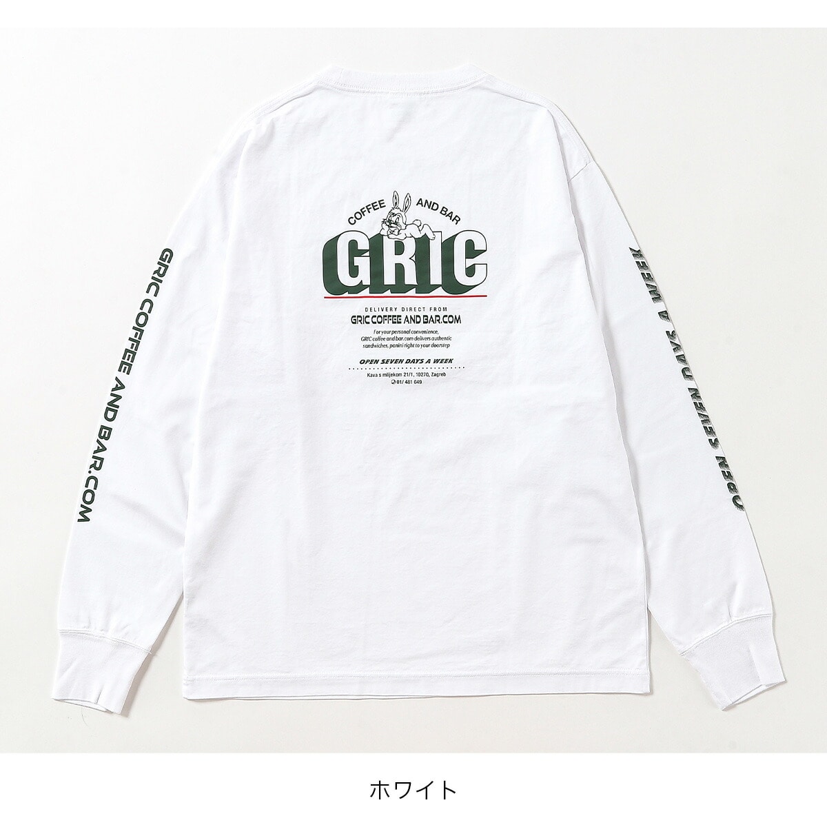 手描き風のウサギは、このカフェのトレードマーク。元スケーターが始めたカフェという裏設定を込め、両袖にもプリントを施し、どこかスケーターらしい雰囲気を表現しています。