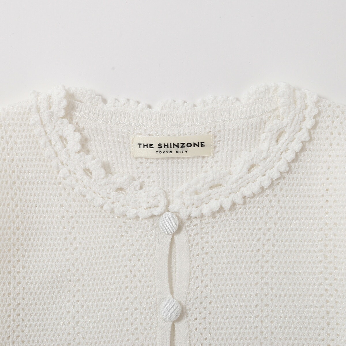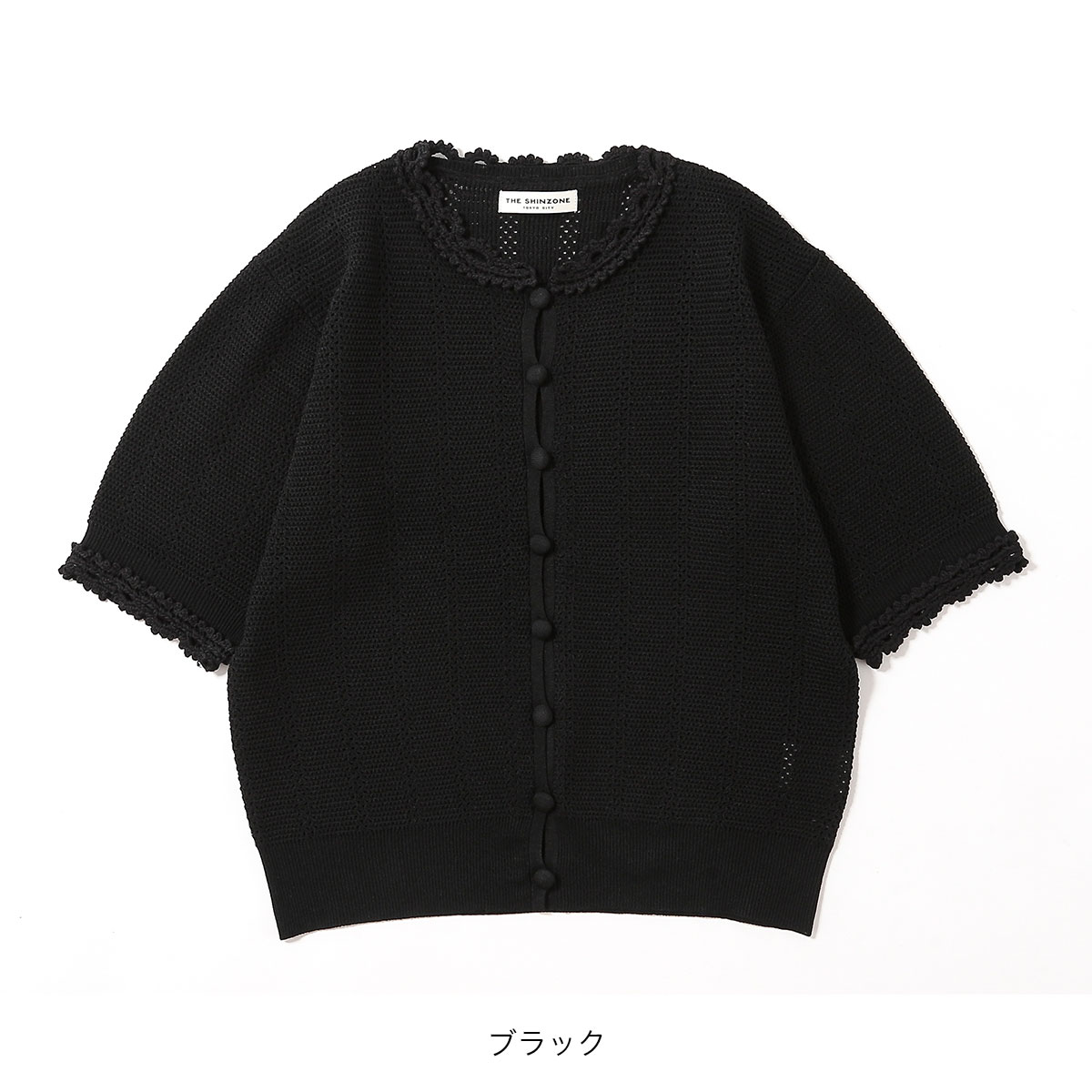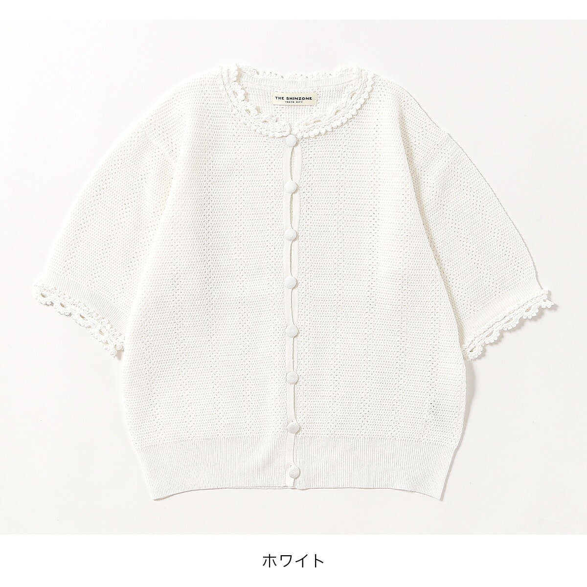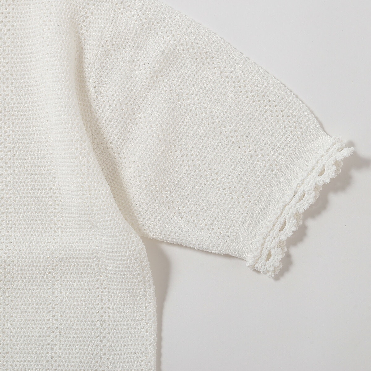 ふくらみと弾力のある糸を使っており、コンパクトなサイズ感ですが、立体的なフォルムに仕上がっています。襟ぐりと袖口には、手編みのかぎ針モチーフレースを付けて華やかな印象に。