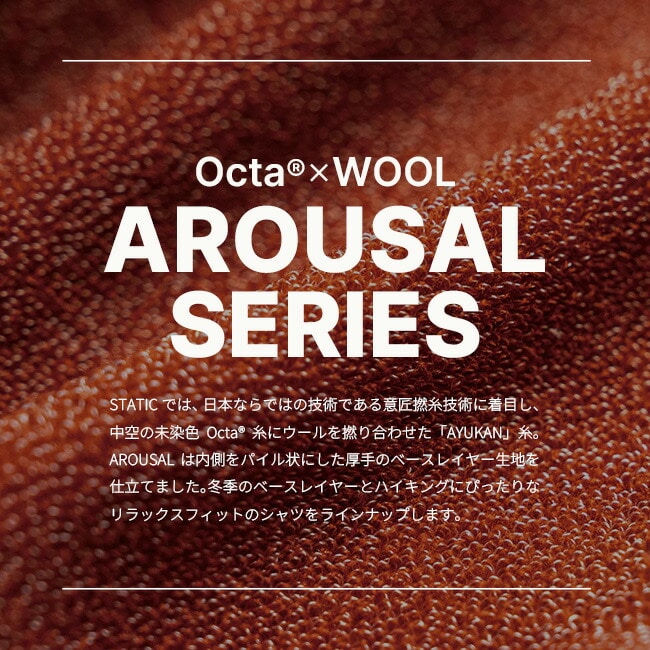 日本ならではの技術である意匠撚糸技術に着目し、中空の未染色Octa®糸にウールを撚り合わせた「AYUKAN」糸。AROUSALは内側をパイル状にした厚手のベースレイヤー生地を仕立てました。