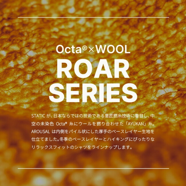 STATICのミッドレイヤーとしては最も高い保温力のニットです。AYUKANをベースに、通常のROARとは違う製法で「Octa®糸に全長1cmほどのウール糸を無数に絡めた特殊糸」を作成。