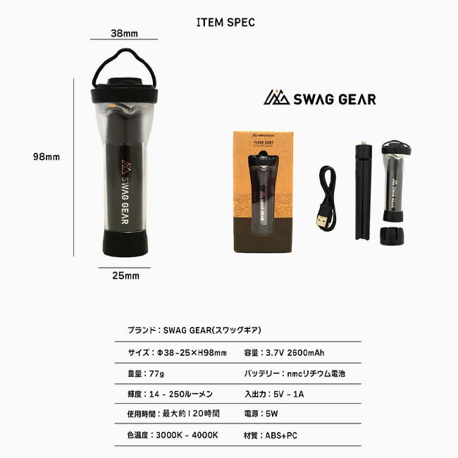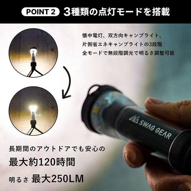 ■点灯モード:フラッシュライト:最大120LM/ランタン:最大250LM