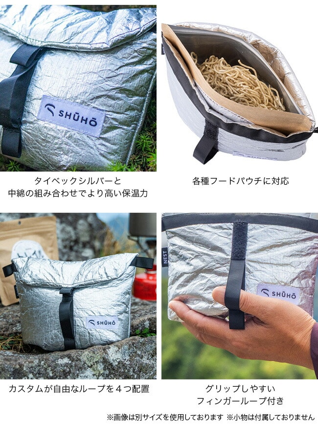 Tyvekシルバーと3Mシンサレートの組み合わせにより高い保温力を実現し、蒸れを軽減しながら、結露による漏れも防ぎます。スモールサイズは尾西・サタケなどのアルファ化米やジップロックS に、レギュラーサイズ(別売)はB.C.FOOD、リゾッタ、スモールツイストなどに対応。