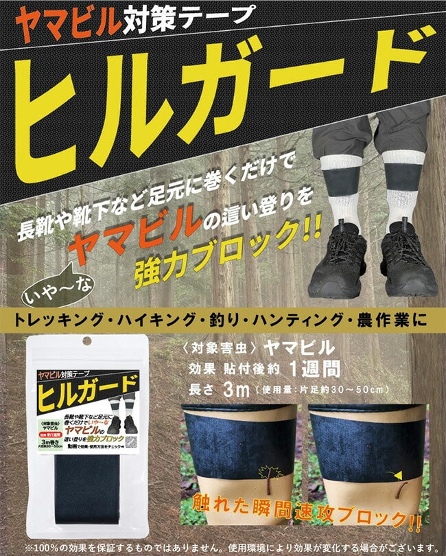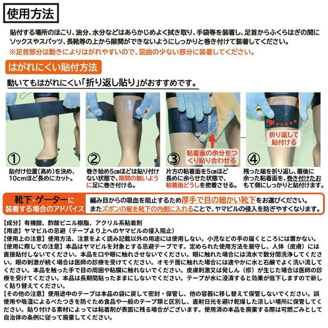 本品はヤマビルを対象とする忌避テープです。定められた使用方法を厳守し、人体(皮膚)には直接貼付しないでください。