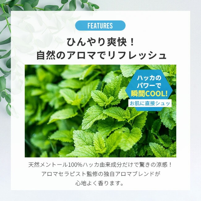 天然ミントのシャワーで涼しくさせる、身体に直接スプレーできるクールダウンスプレーです。ひんやりを楽しみたい方やリフレッシュしたい方におすすめ!