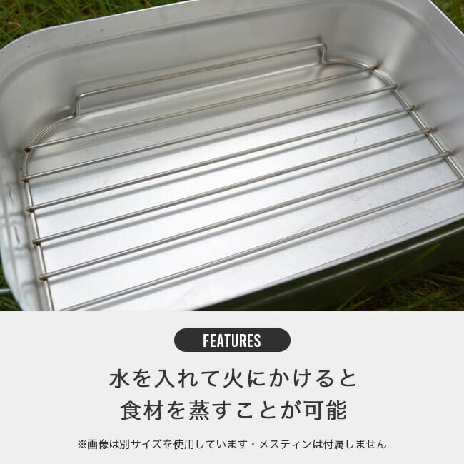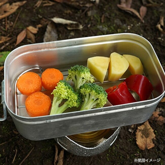 メスティン本体は、携行性を考え薄いアルミを使用しています。メスティンの形状に完璧にフィットし、蒸し料理が楽しめるステンレス製メッシュトレイ。