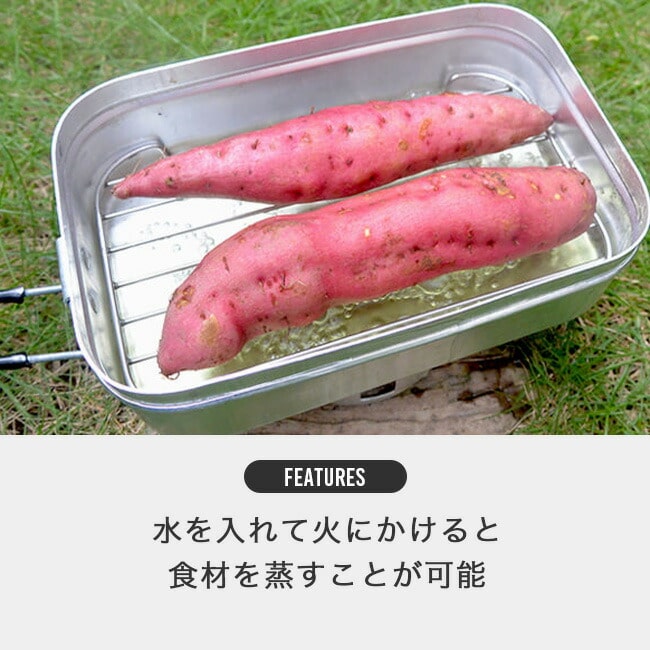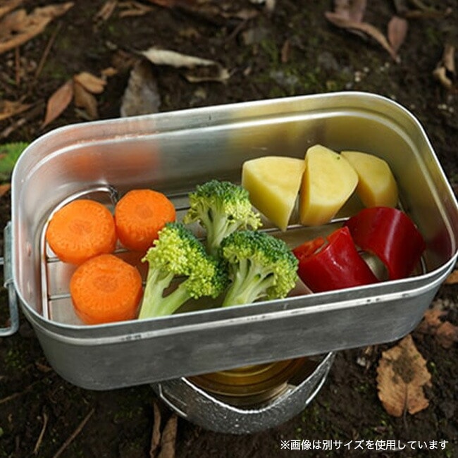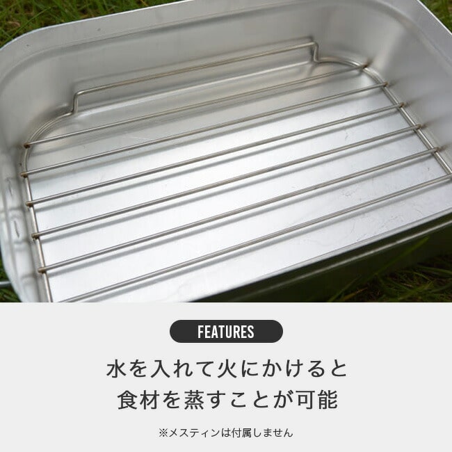 メスティン本体は、携行性を考え薄いアルミを使用しています。メスティンの形状に完璧にフィットし、蒸し料理が楽しめるステンレス製メッシュトレイ。