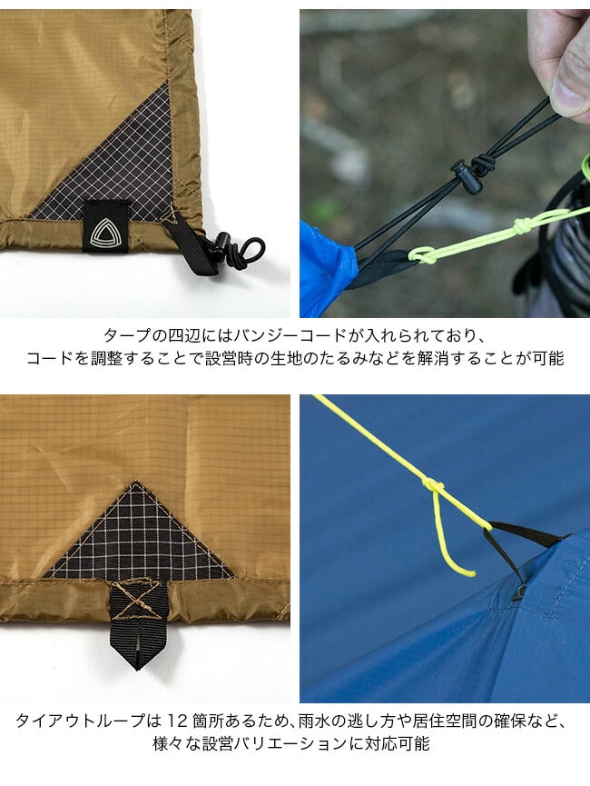 ・タープの辺に沿っていれられたバンジーコードはタープのたるみを調整