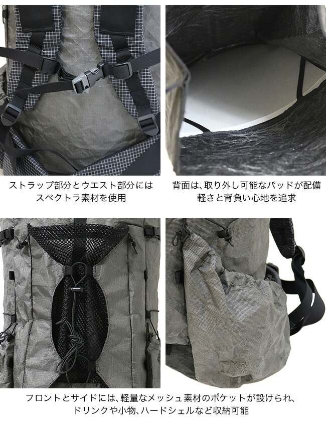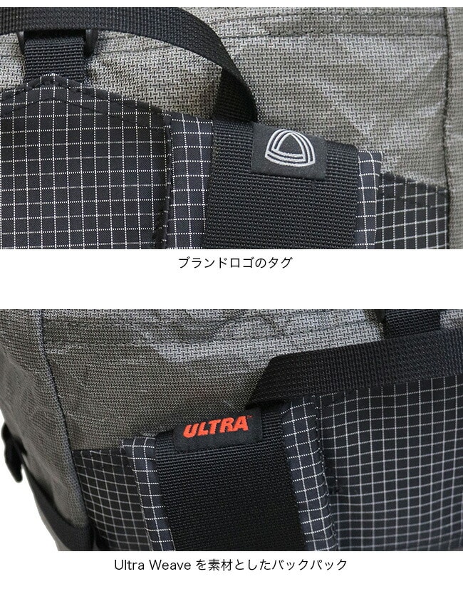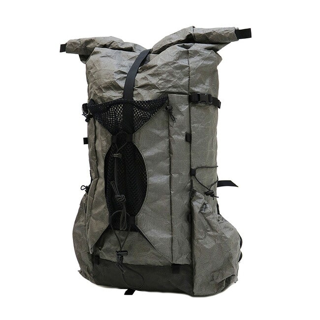初期UL(ウルトラライト)のバックパックを彷彿させる、TRAIL BUMのバッグの特徴である筒型の本体に拡張部を持ったロールトップ仕様のバックパックです。素材は、耐摩耗・耐衝撃性に優れる、超高分子量ポリエチレン新繊維「ULTRA WEAVE Ultra200X」を使用し、擦り減る底面の部分と本体部分で「ULTRA WEAVE Ultra200X」の厚さを変える徹底ぶり。