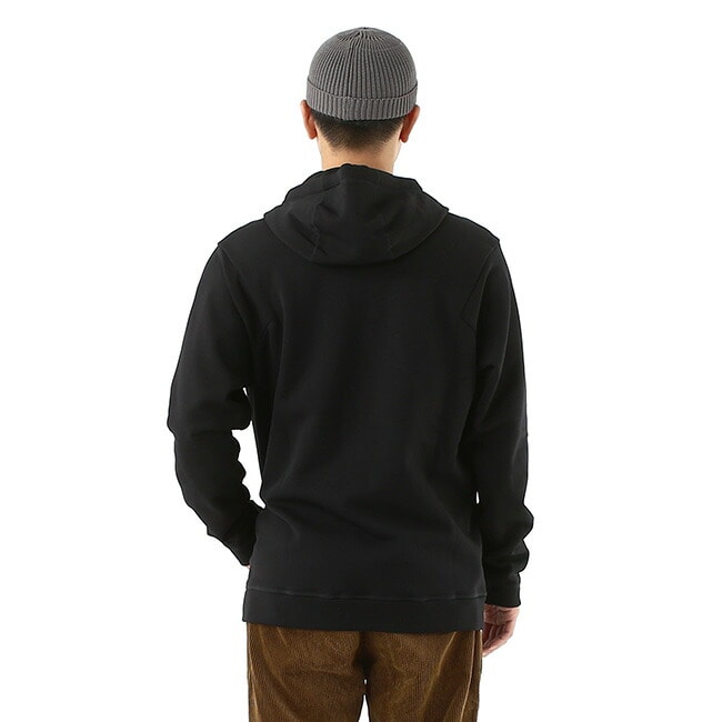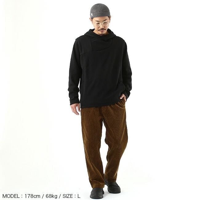 フードのフロント部分がクロスしながら胸元におさまるディテール。このデイテールならでジッパーを配置せずとも自然と首元を覆うことができます。