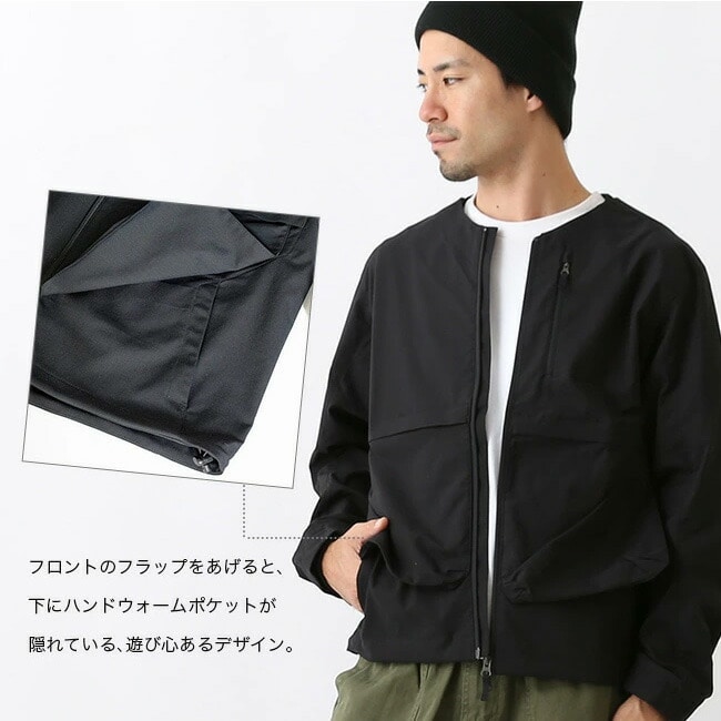 フラップポケットとハンドウォーマーポケットのディテールが特徴的。ストレッチ性のファブリックと少しゆったりなパターンがストレスを感じないフィット感を生み出している。