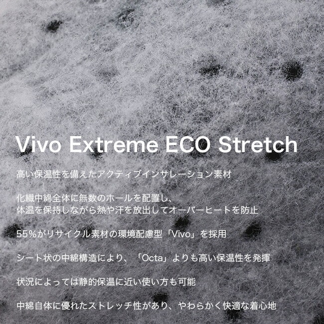 中綿に保温性、通気性、ストレッチ性を備える「Vivo Extreme ECO Stretch」を使用しています。