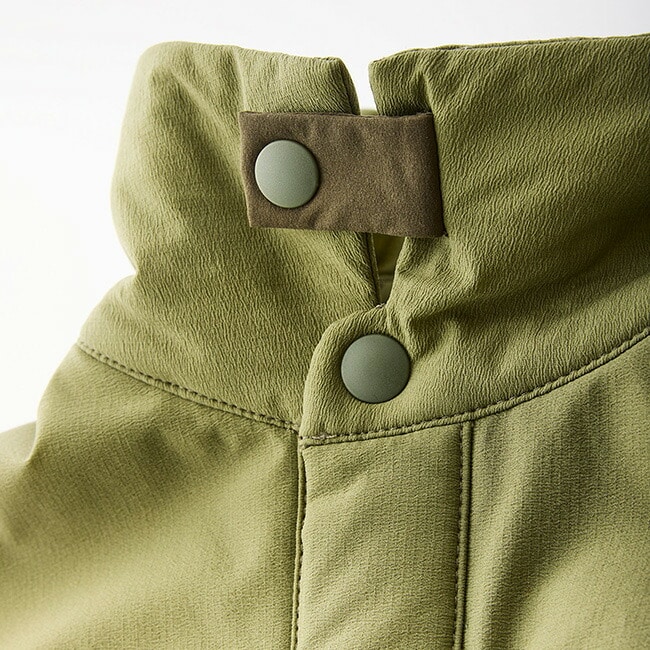 襟にも中綿を入れてあり、寒いときは襟を立てて首周りを保温可能。