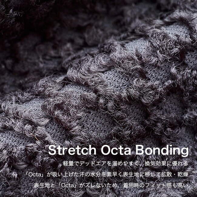 ストレッチ性の高い基布に「Octa」を貼り付けたこの素材は、保温性と通気性、吸汗速乾性のバランスが良く、ボンディングにより表地と裏地が一体化したことで運動性も良好です。