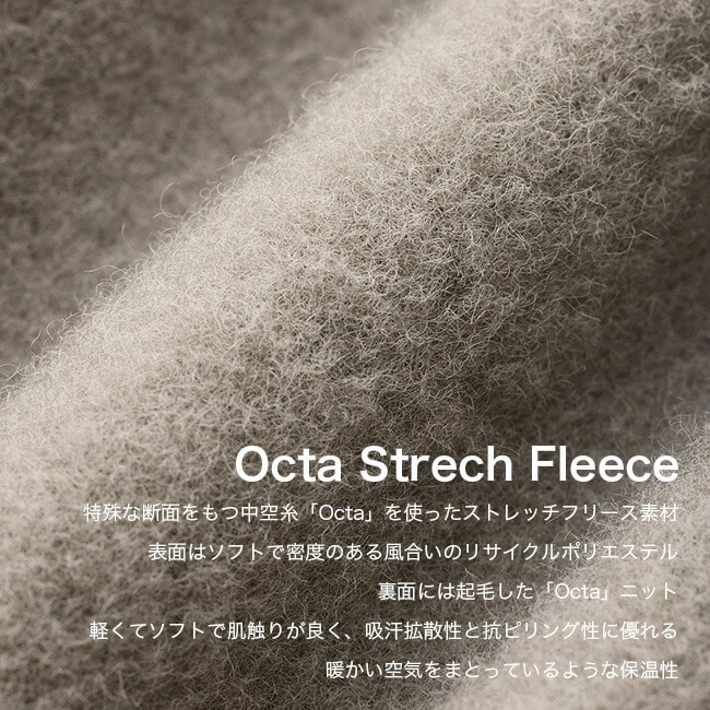 「Octa Stretch Fleece」で創ったパンツです。裏面の「Octa」は、中空糸ならではの軽さと保温性に加えて、ストレッチ性と通気性、優れた吸汗拡散性を併せ持つ素材。