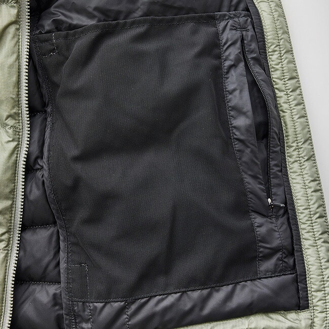 中綿にアライド社製850フィルパワー撥水ダウンを100g充填。