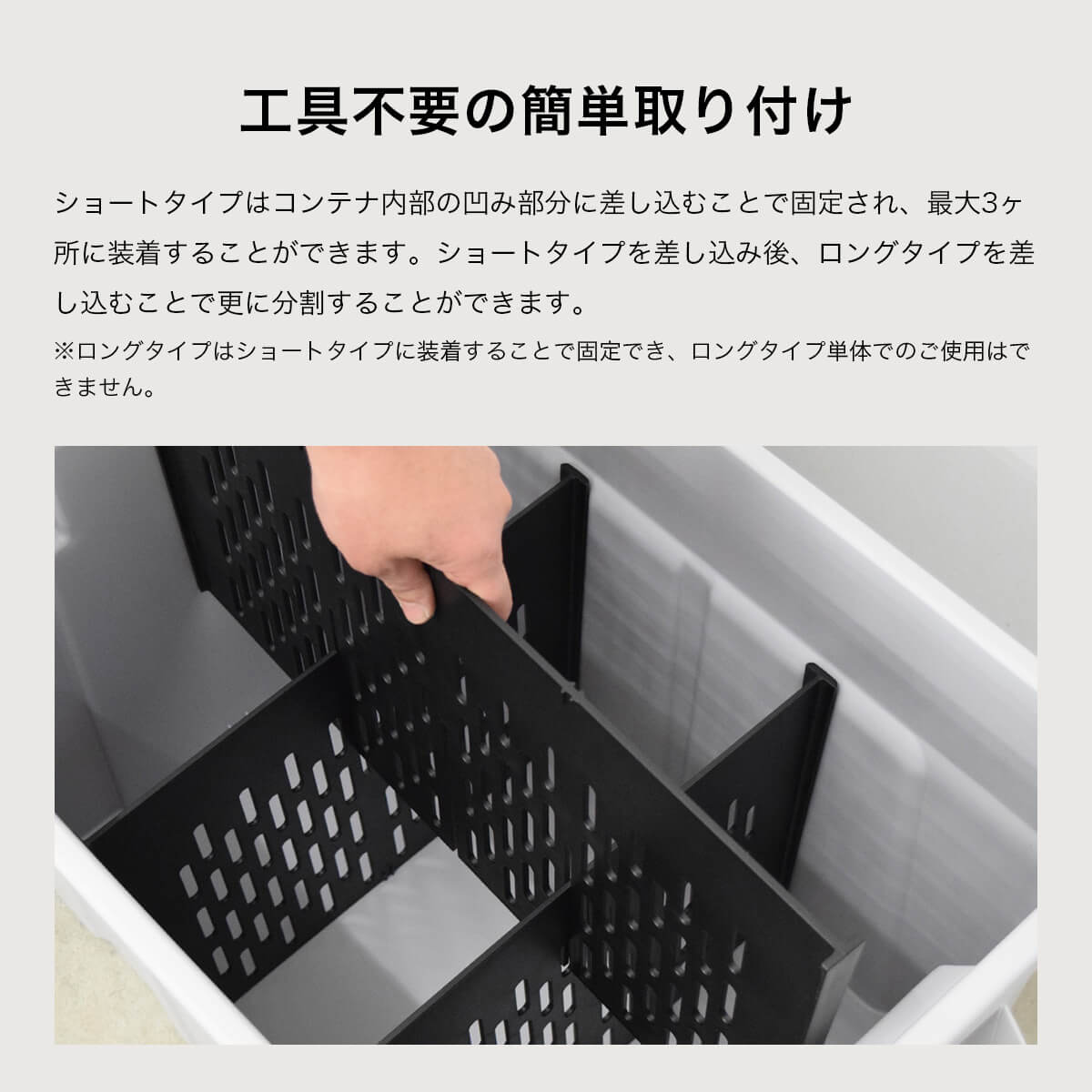 ショートタイプはコンテナ内部の凹み部分に差し込むことで固定され、 コンテナ内最大3ヶ所に装着可能。