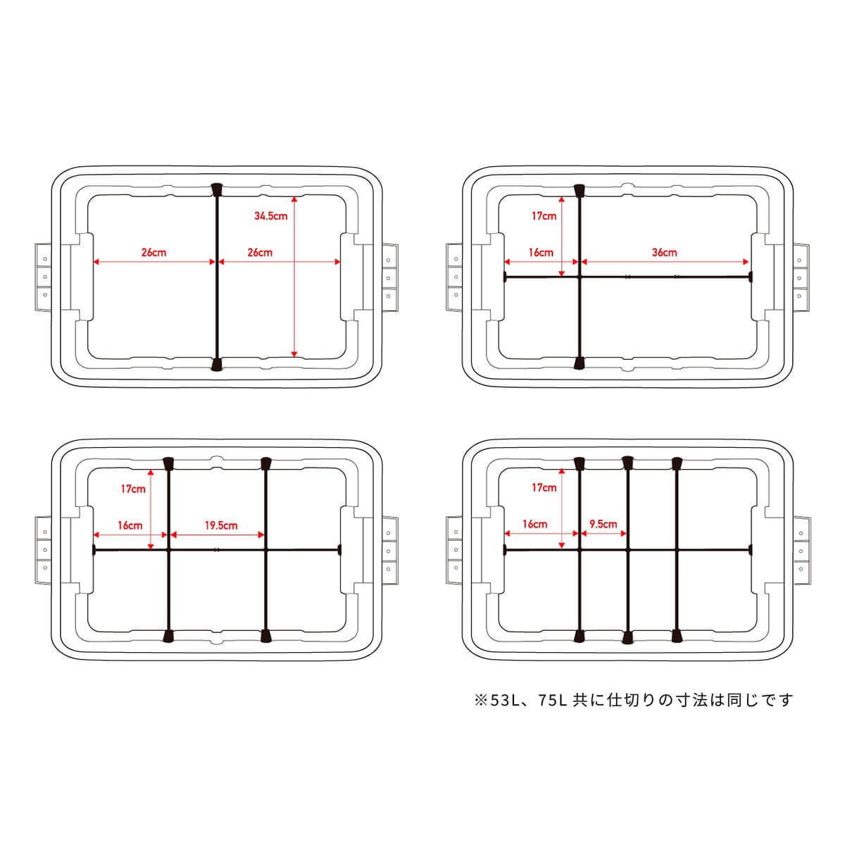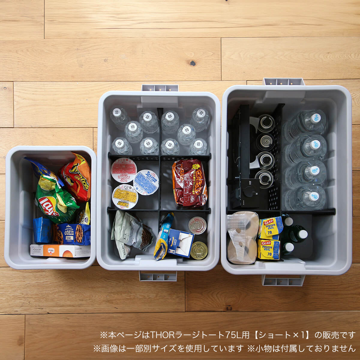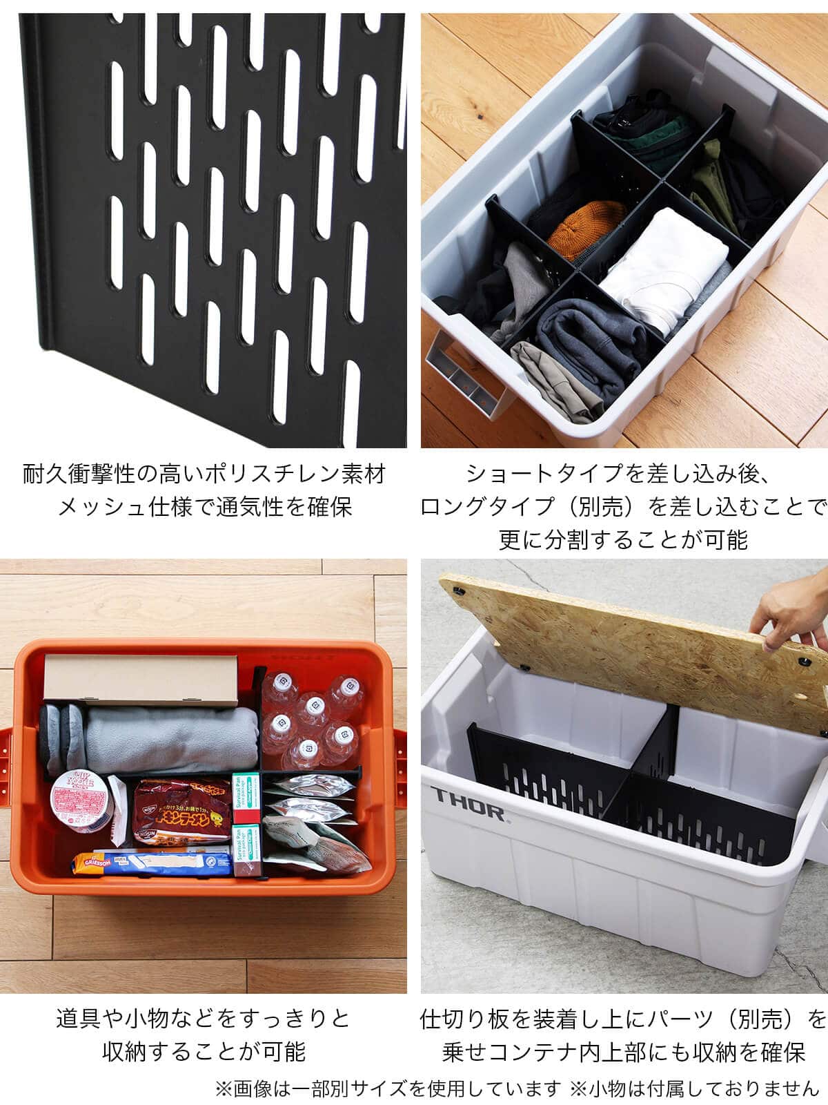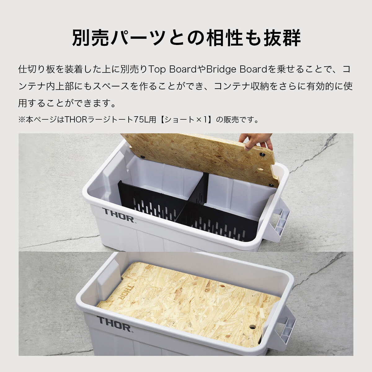 また、仕切り板を装着した上に別売りTop BoardやBridge Boardを乗せることで、コンテナ内上部にもスペースを作ることができ、有効的に使用することができます。